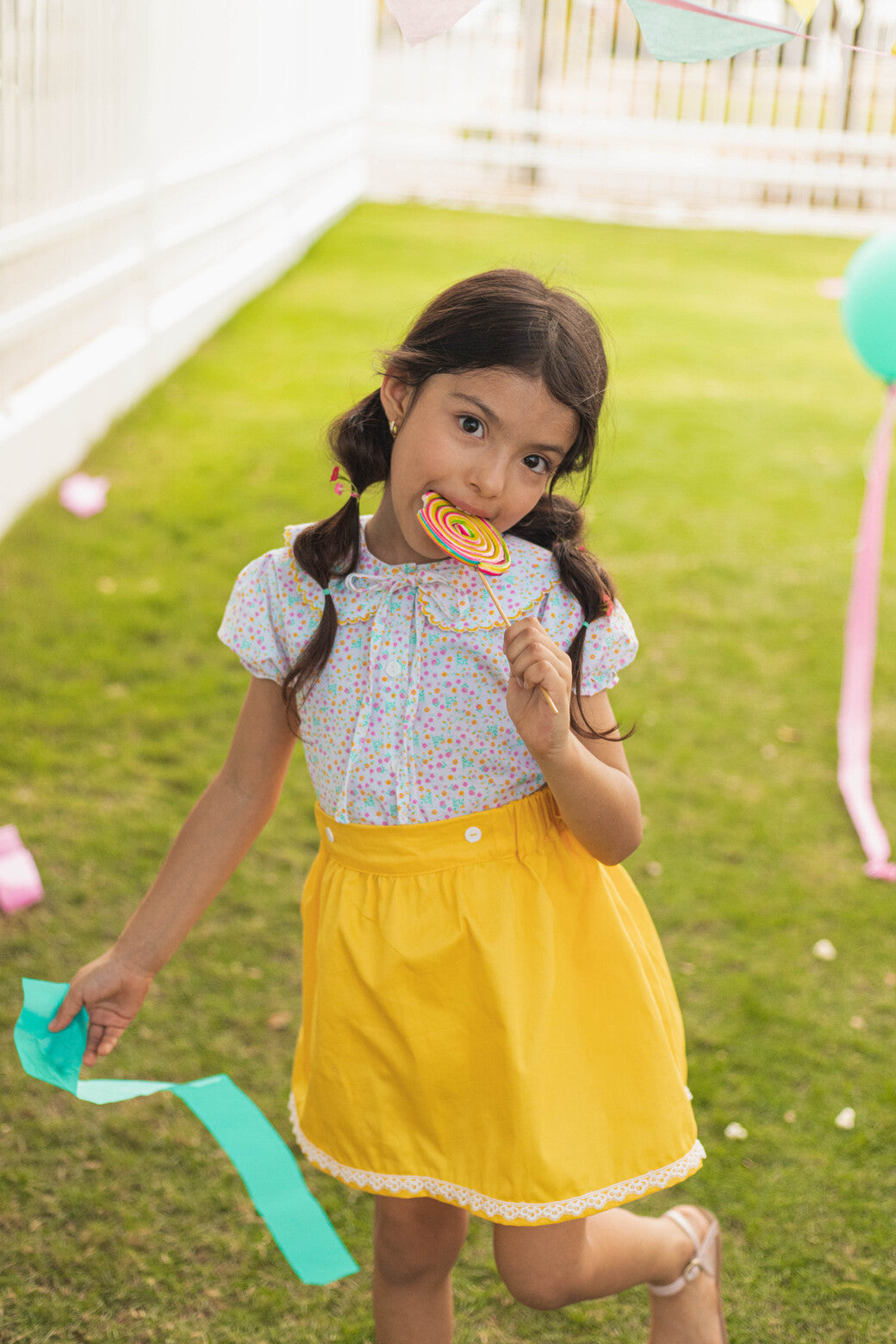 Blusa con cuello marinero ajustable, está hermosa blusa puedes usarlas con o sin cuello, es muy versátil ya que también puedes usarla con los botones hacia atrás. Y su hermoso cuello marinero lleva unas ondas en amarillo en todo su borde, haciendo esta prenda aún más especial.