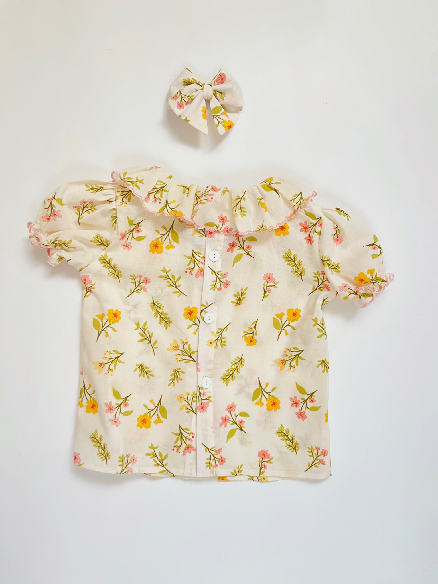 Esta hermosa blusa es confeccionada en algodón 100% y cuenta con mangas abullonadas y cuello volante, lleva abotonadura en forma de flor en su espalda.