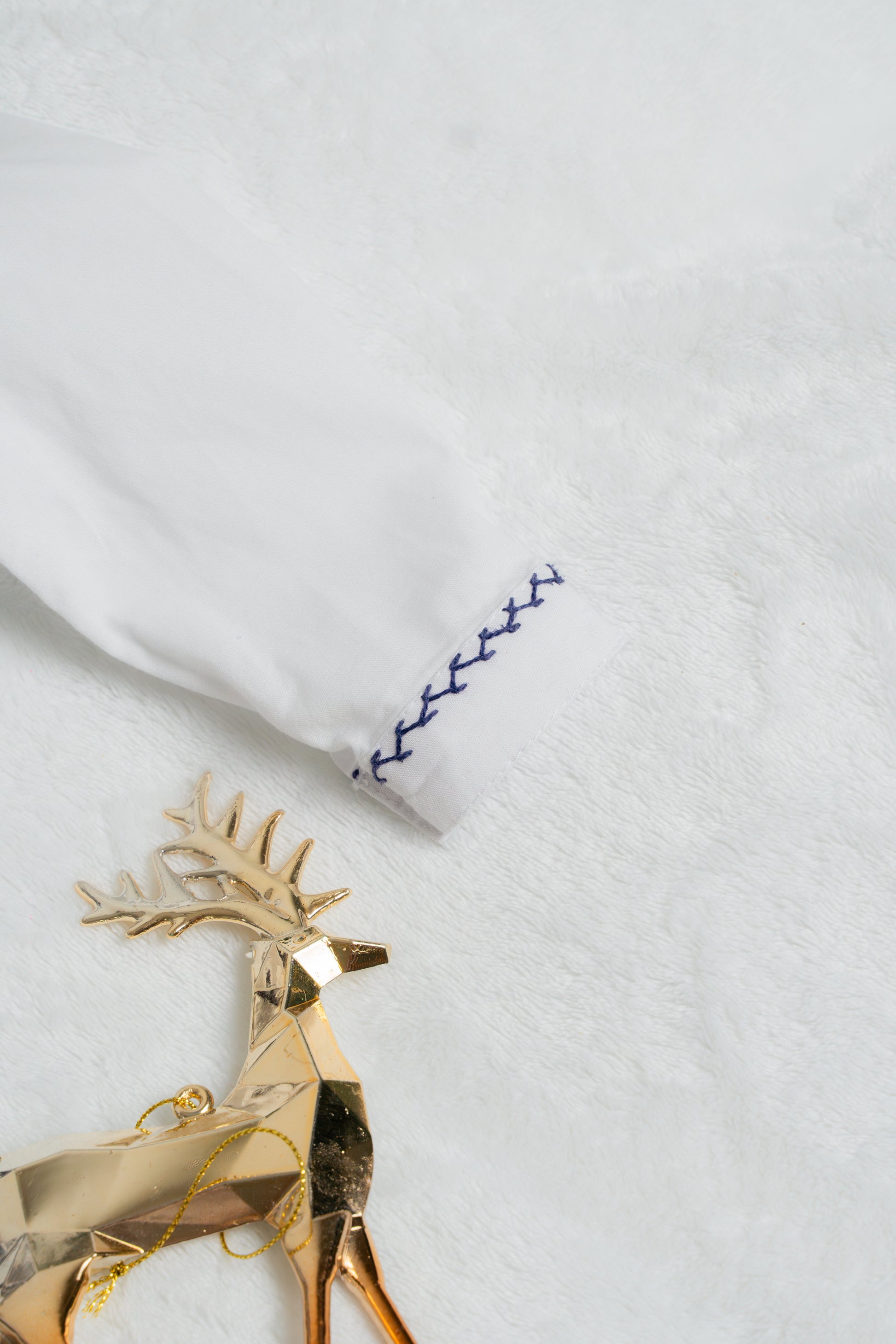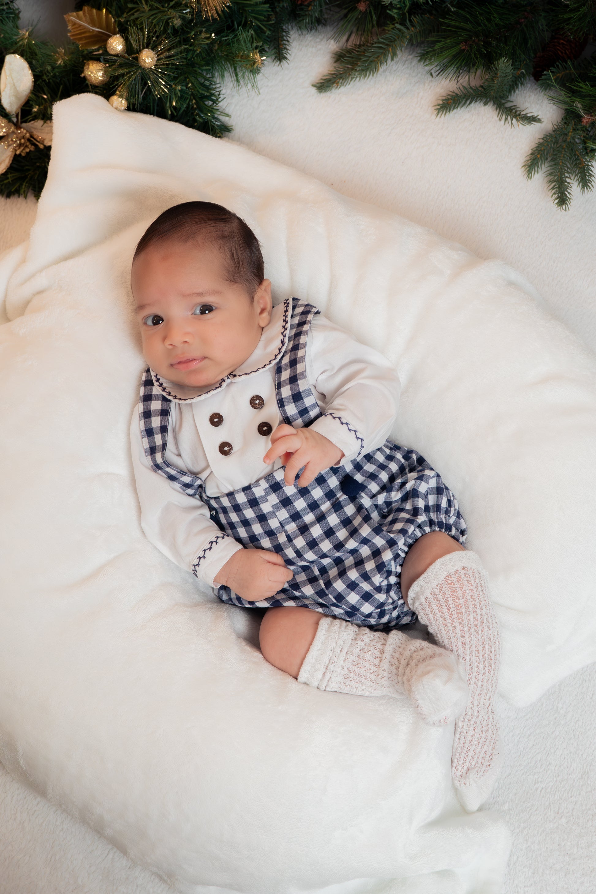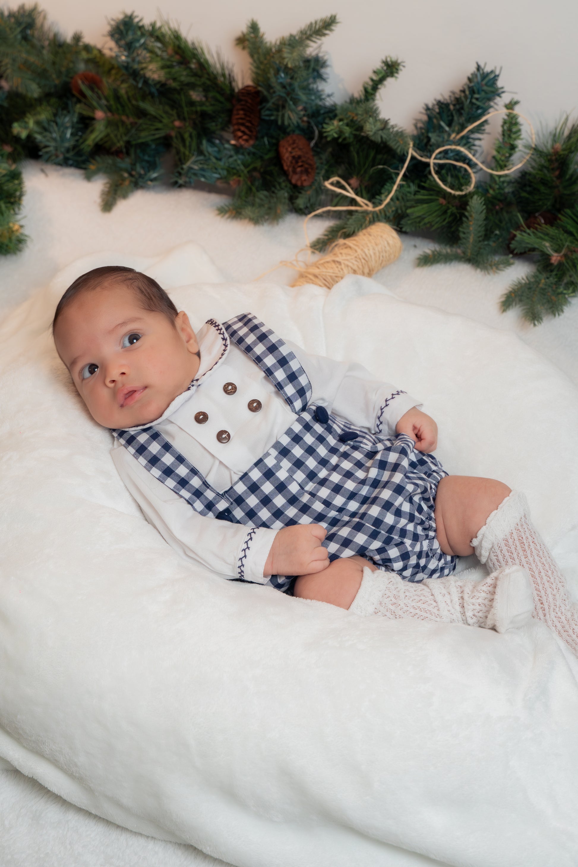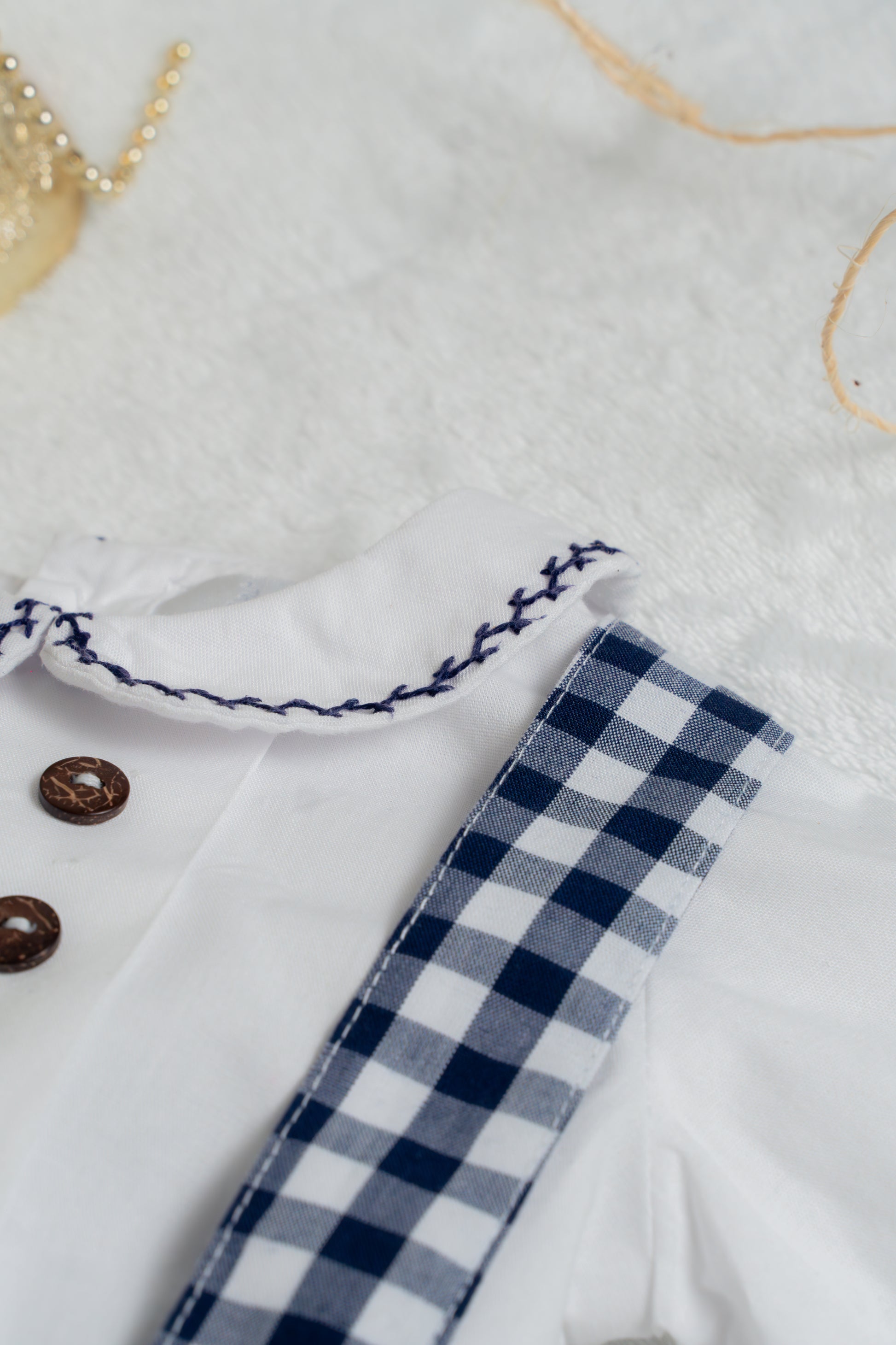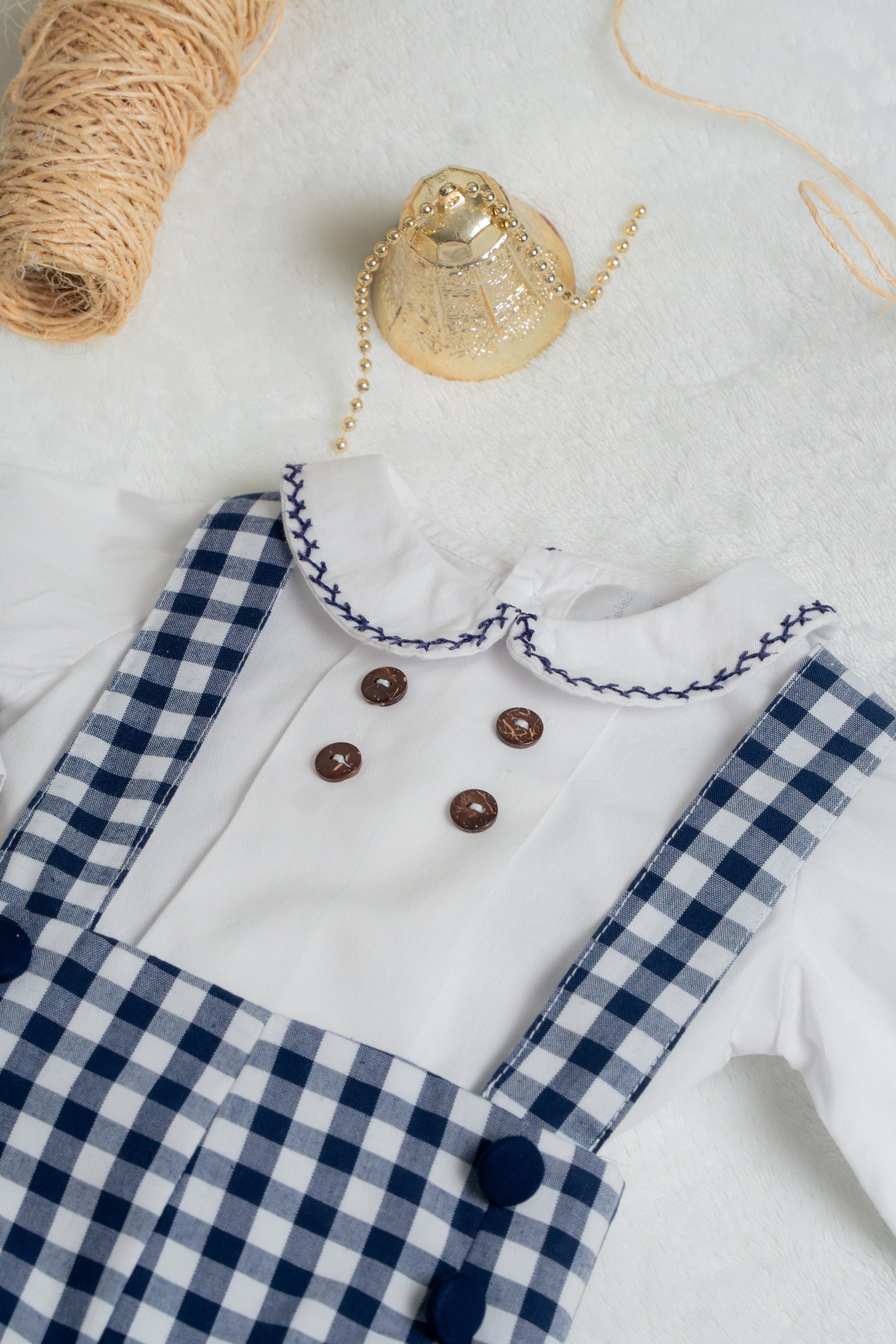 El conjunto de dos piezas e cuadros azul marino con camisa manga larga con detalles en cuello Peter Pan y puños, cuenta con botones de coco decorativo en pecho. Es un conjunto encantador y clásico para los más pequeños. Un look atemporal y refinado, perfecto para ocasiones especiales o para vestir en fiestas.