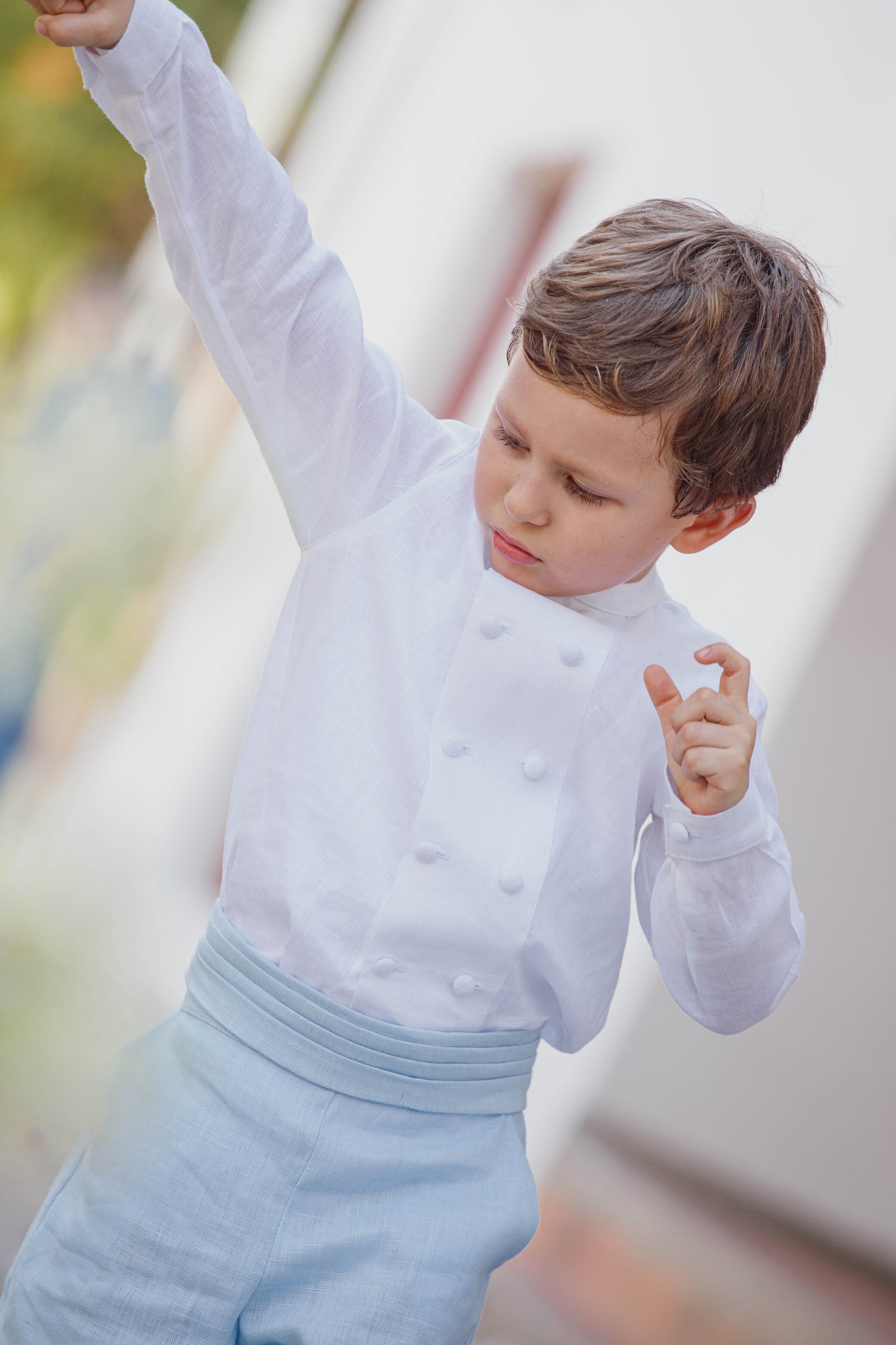 Este conjunto ceremonia inglés está confeccionado en lino 100%, lleva una camisa en lino blanca con cuello Mao y doble botón frontal, cuenta con un pantalón a las rodillas en lino algodón. Incluye fajín.