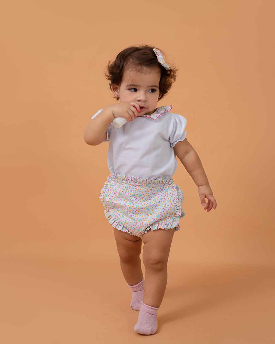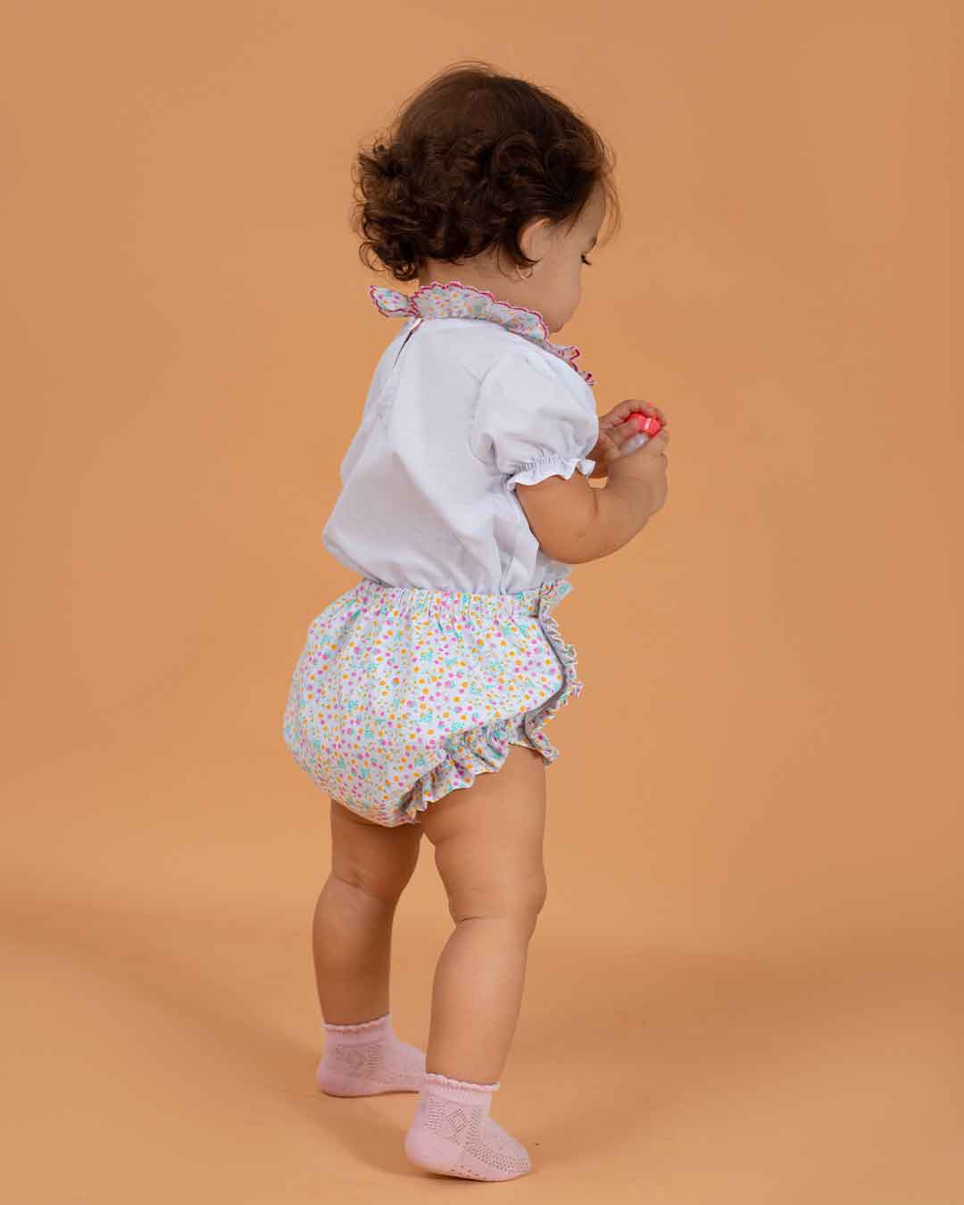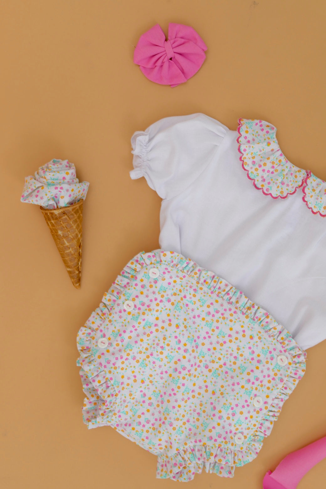 Un conjunto ideal para las más pequeñas! Este hermosos conjunto de flores Fair Garden tiene un cubre pañal con botones en el frente y completamente forrado. Cuenta con una hermosa blusa de cuello bebe a juego con el tejido del cubre pañal.