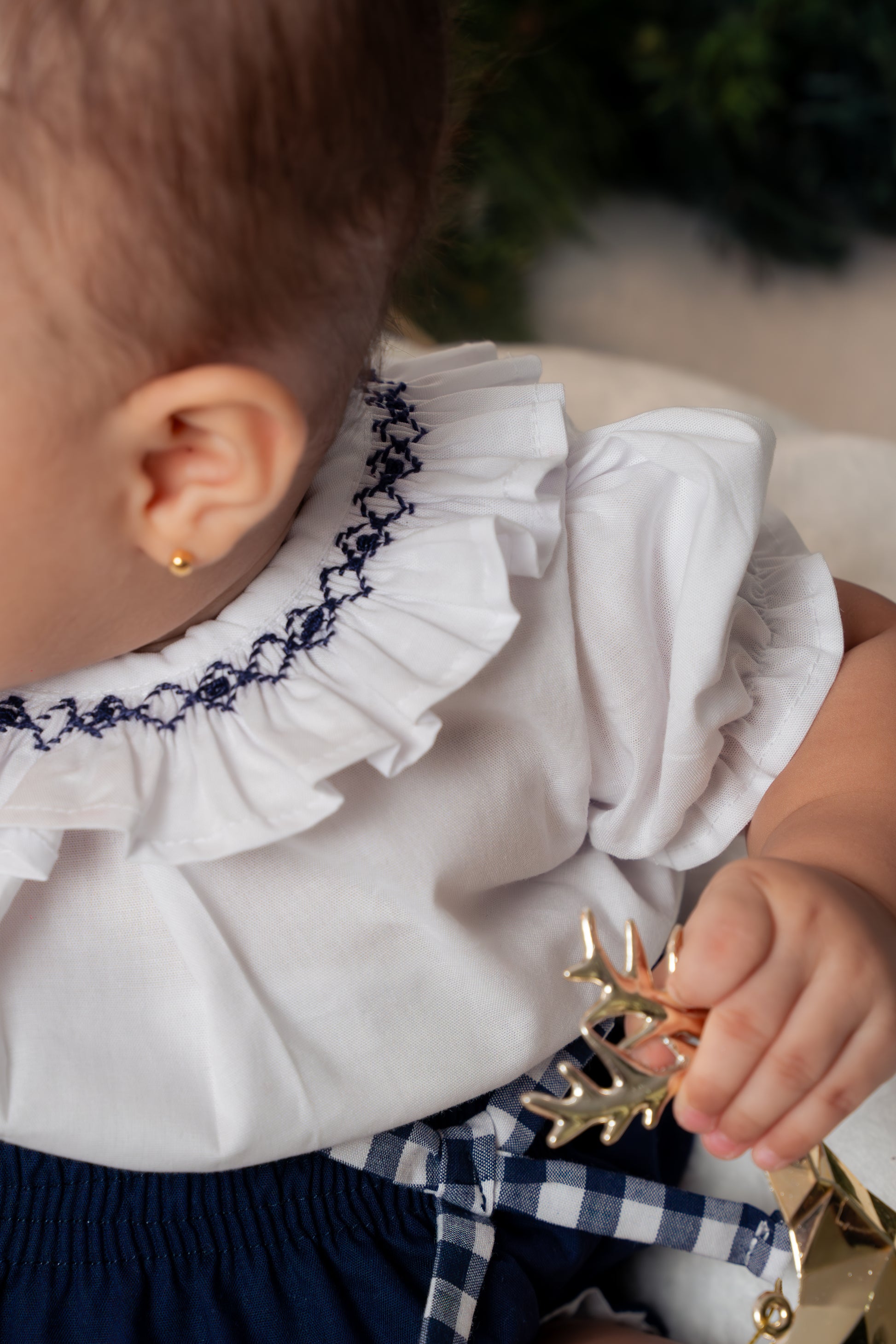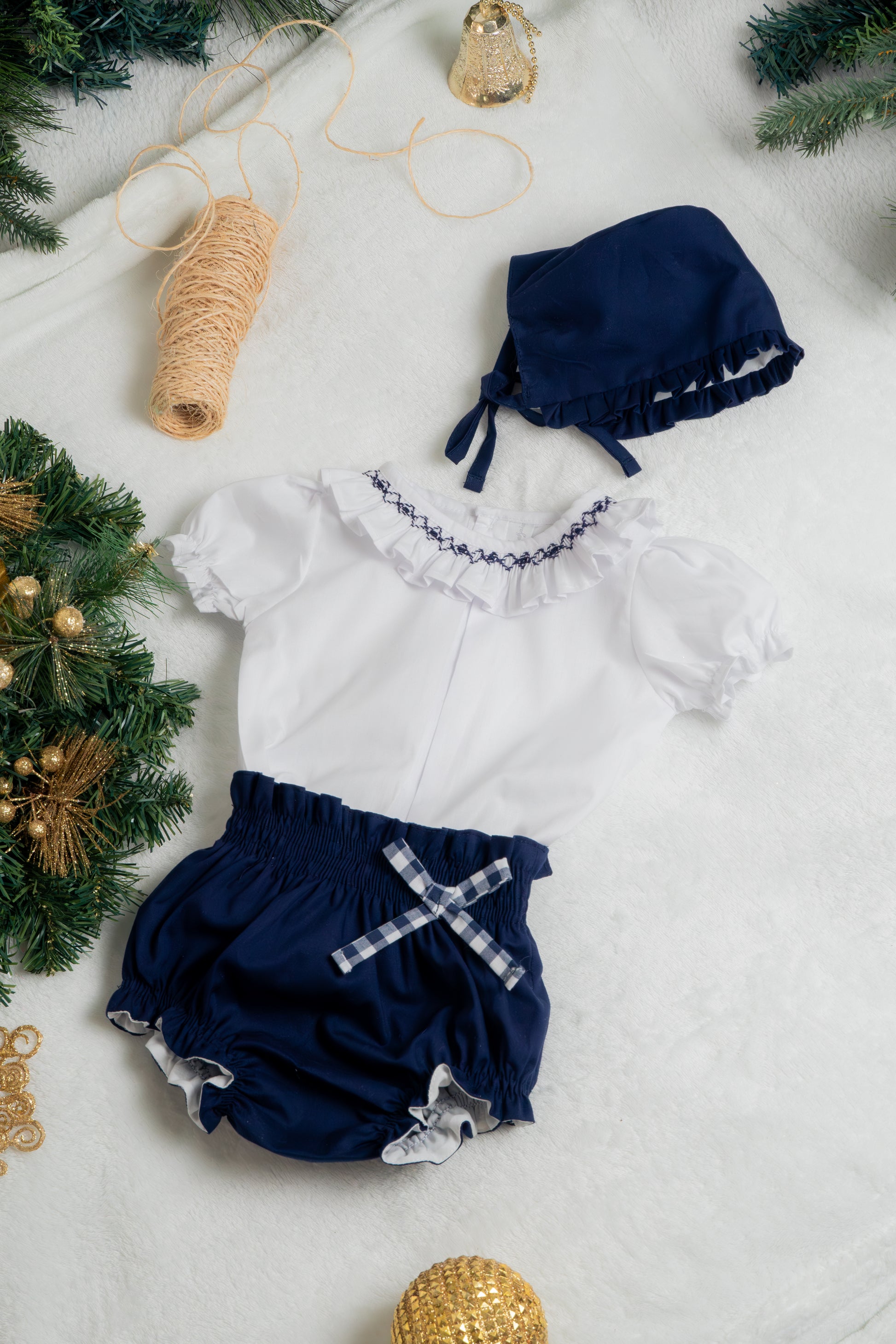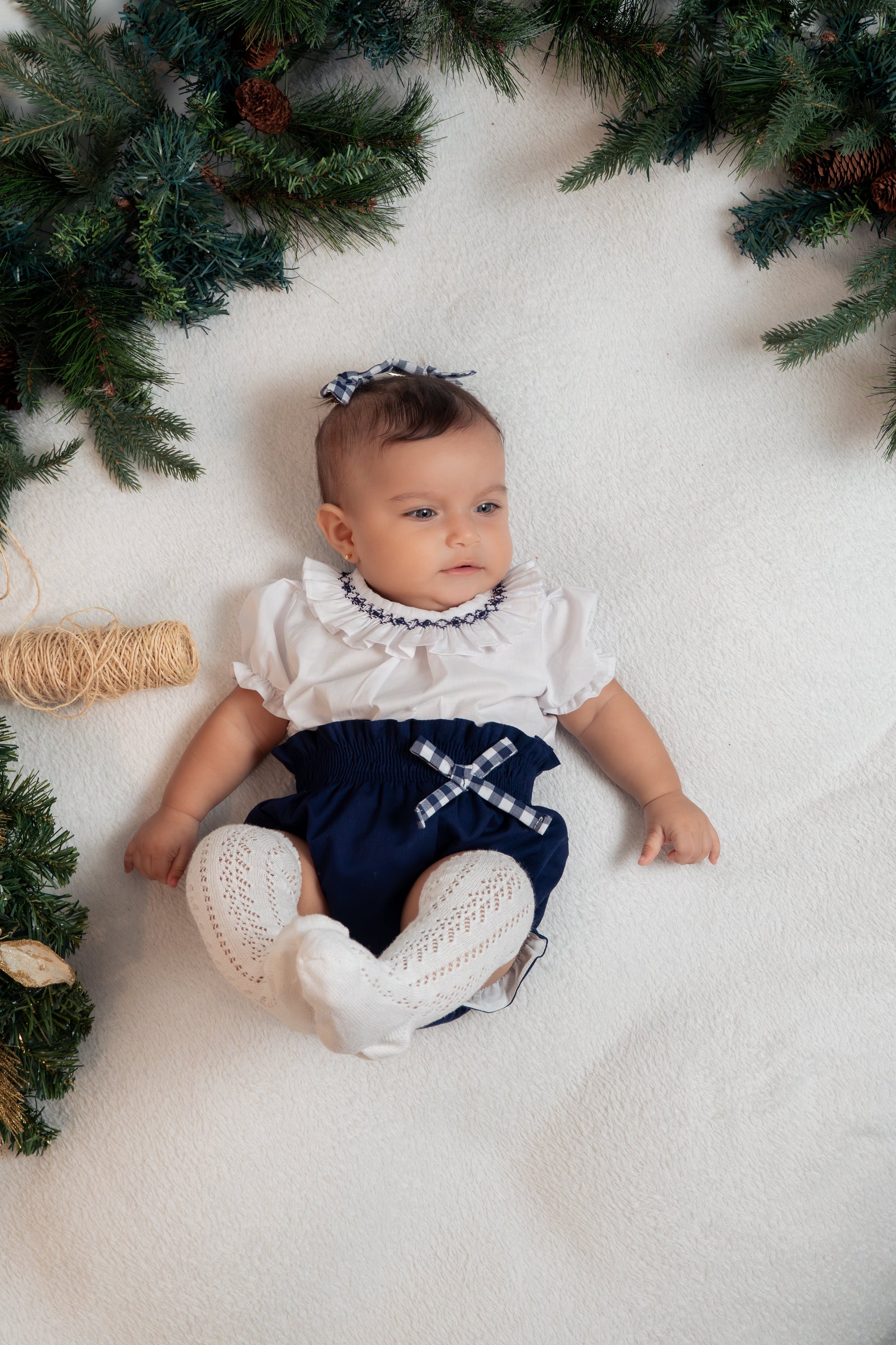 Una conjunto esencial en el armario de cualquier bebe, cuenta con una blusa de manga corta abullonada que presenta un cuello fruncido a mano característico de la marca con la tecnica de nido de abeja o punto smock. Combinada con estos bombachos azul marino que cuentan con una cintura elástica fruncida para un ajuste perfecto y puños elásticos en las piernas para una mayor comodidad. Adornado con un lazo delicado en su costado de estampado cuadros azul marino y blanco nieve.