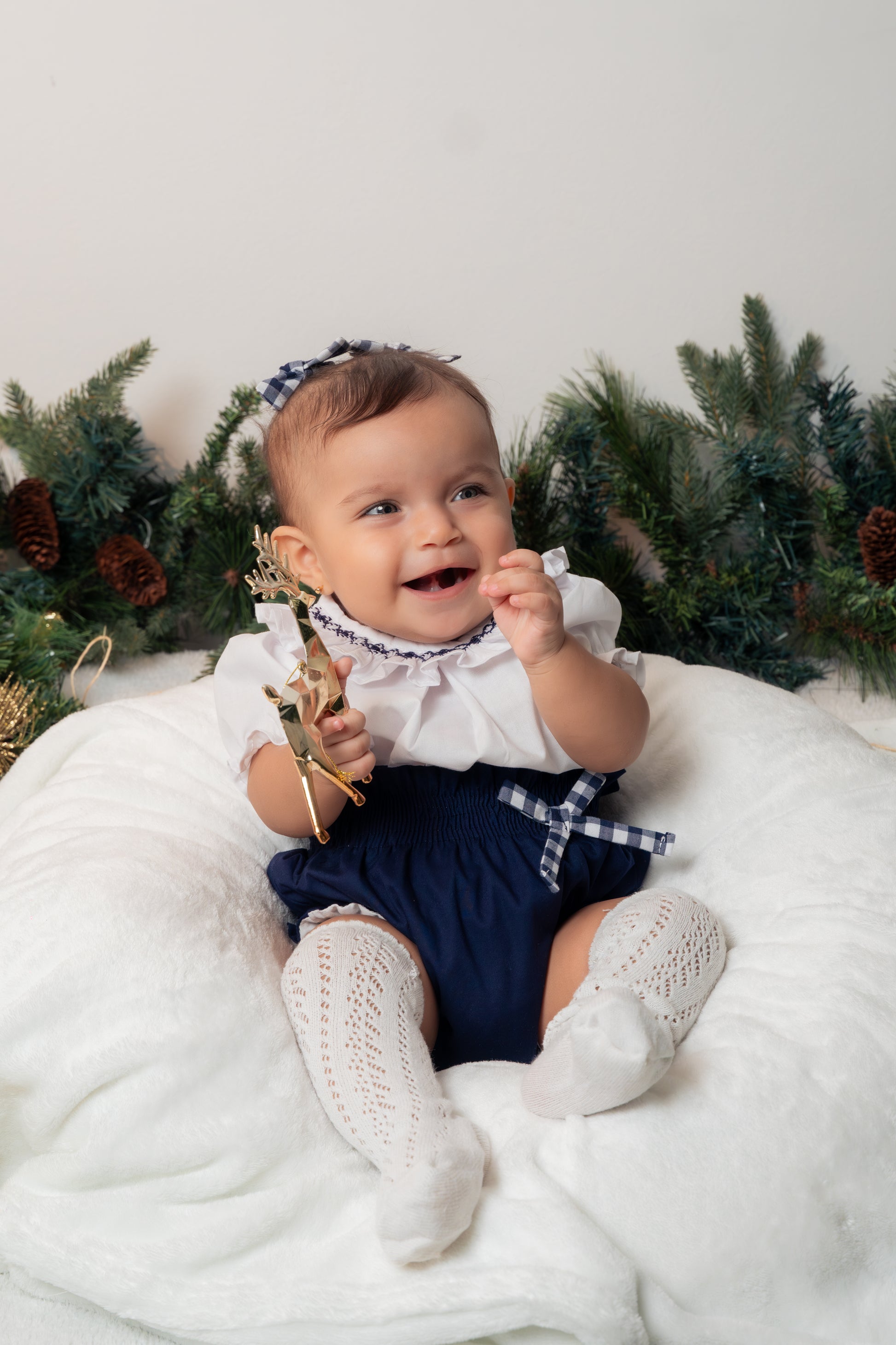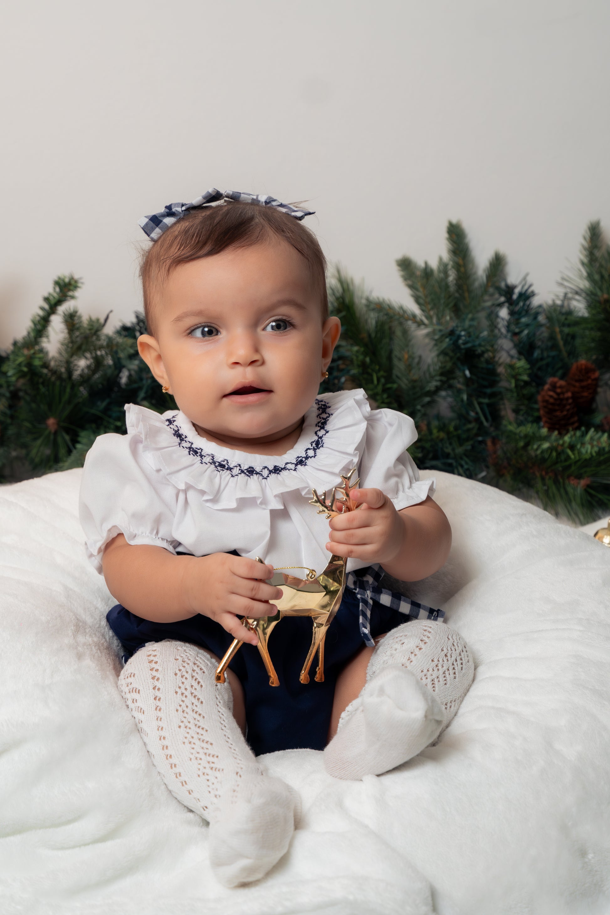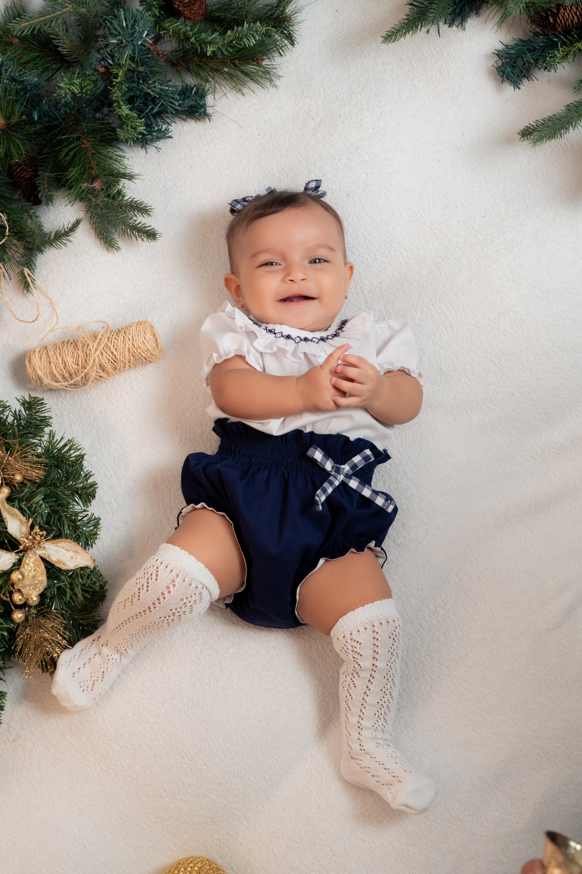 Una conjunto esencial en el armario de cualquier bebe, cuenta con una blusa de manga corta abullonada que presenta un cuello fruncido a mano característico de la marca con la tecnica de nido de abeja o punto smock. Combinada con estos bombachos azul marino que cuentan con una cintura elástica fruncida para un ajuste perfecto y puños elásticos en las piernas para una mayor comodidad. Adornado con un lazo delicado en su costado de estampado cuadros azul marino y blanco nieve.