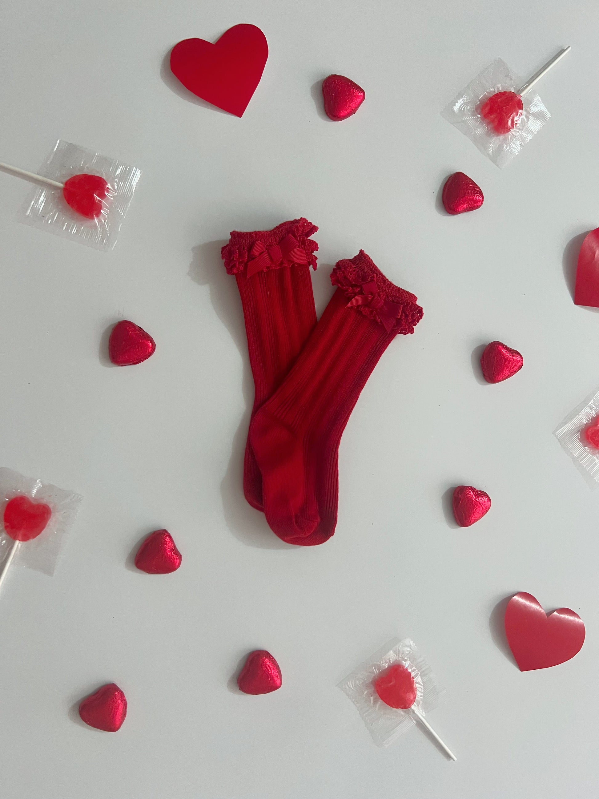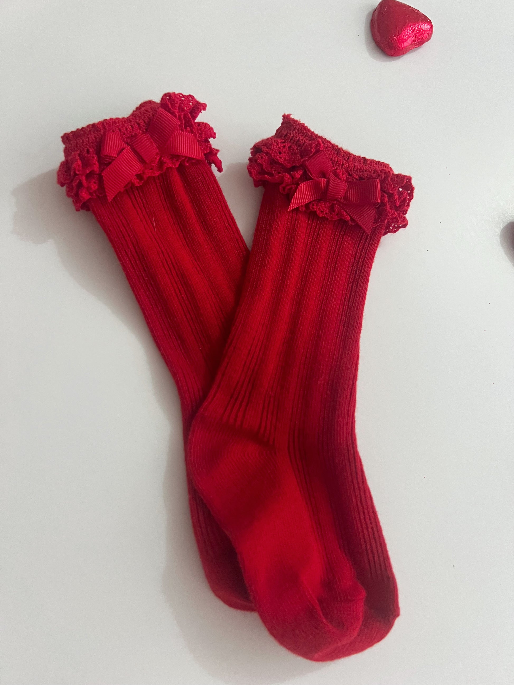 Medias de algodón roja, con encaje en sus orillas y un delicado lazo en su costado.