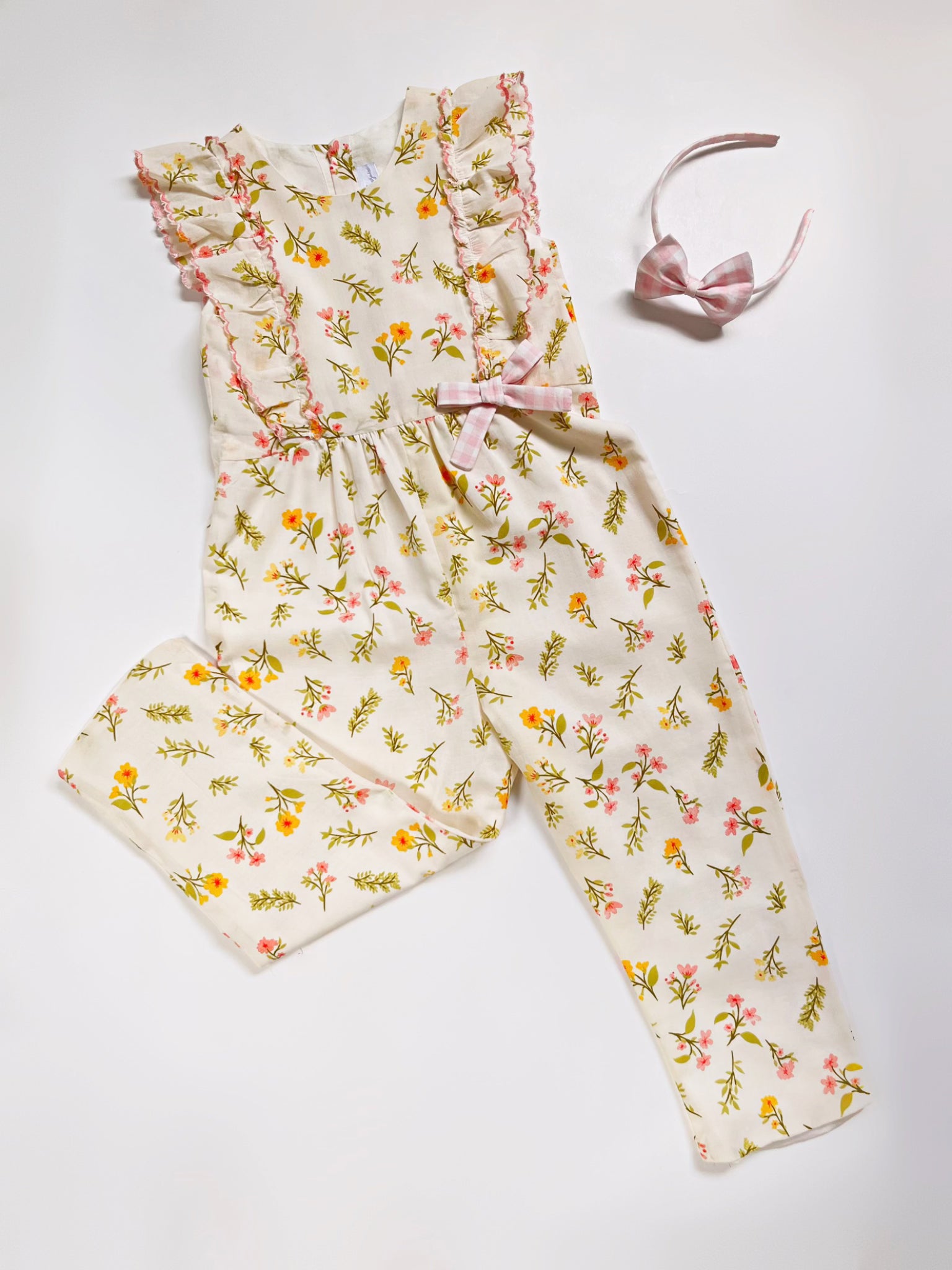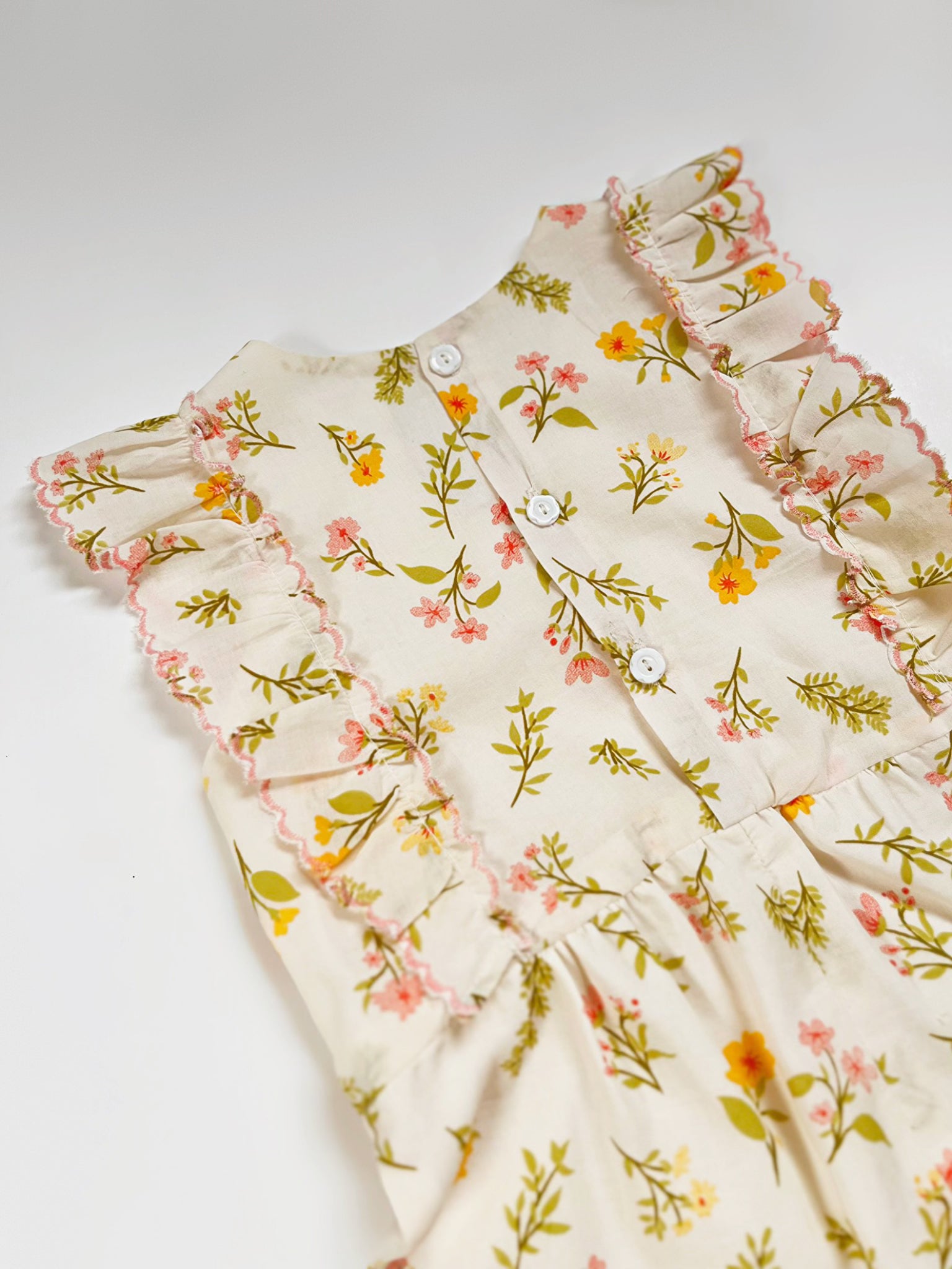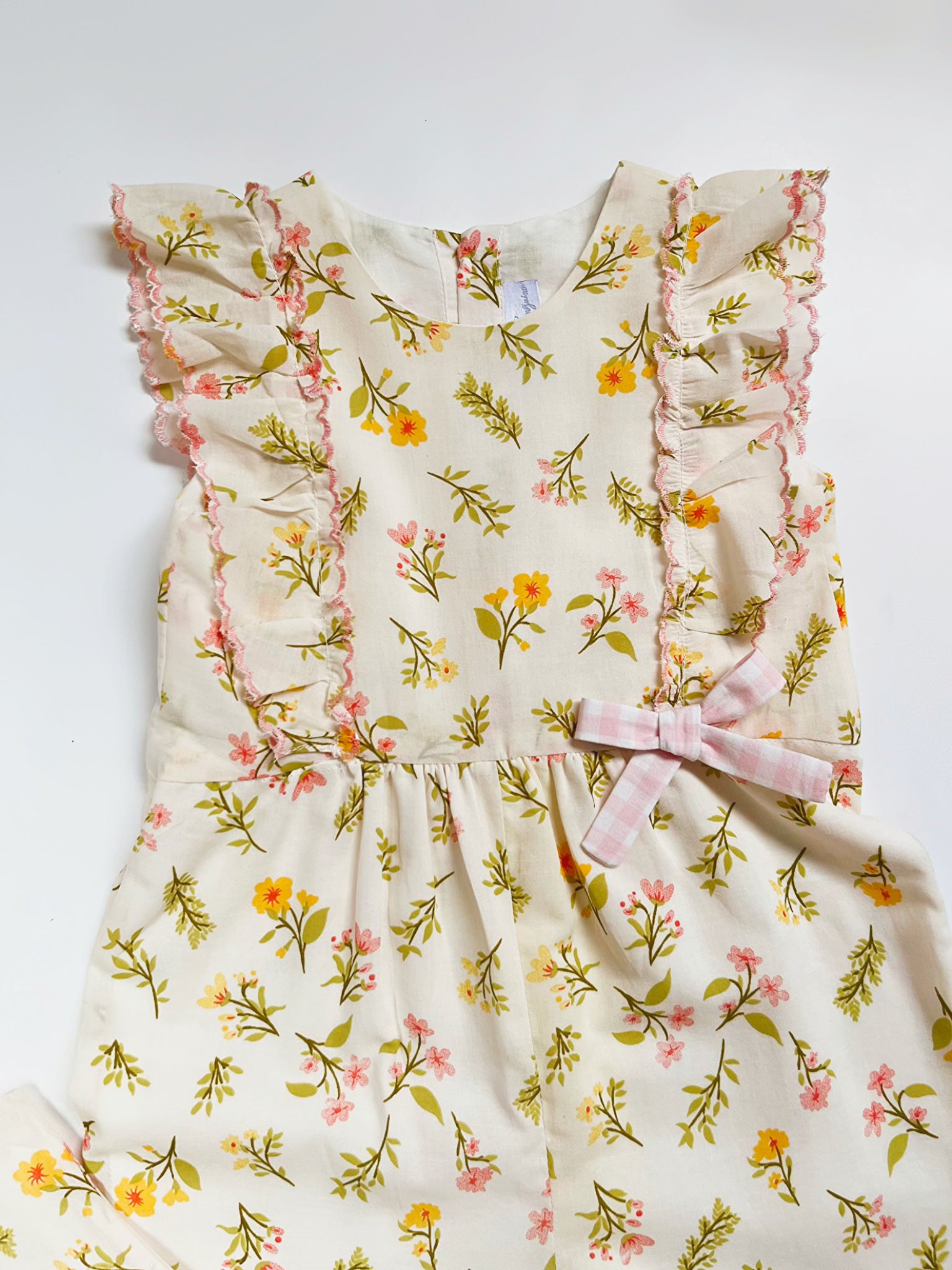 Este hermoso mono es ideal para los días cálidos, se encuentra completamente forrado y cuenta con unos volantes en pecho y espalda que llevan unas delicadas ondas en sus orillas en tono rosa y un lazo en cuadros rosas con blancos para ser de esta prenda mas encantadora en su parte delantera.