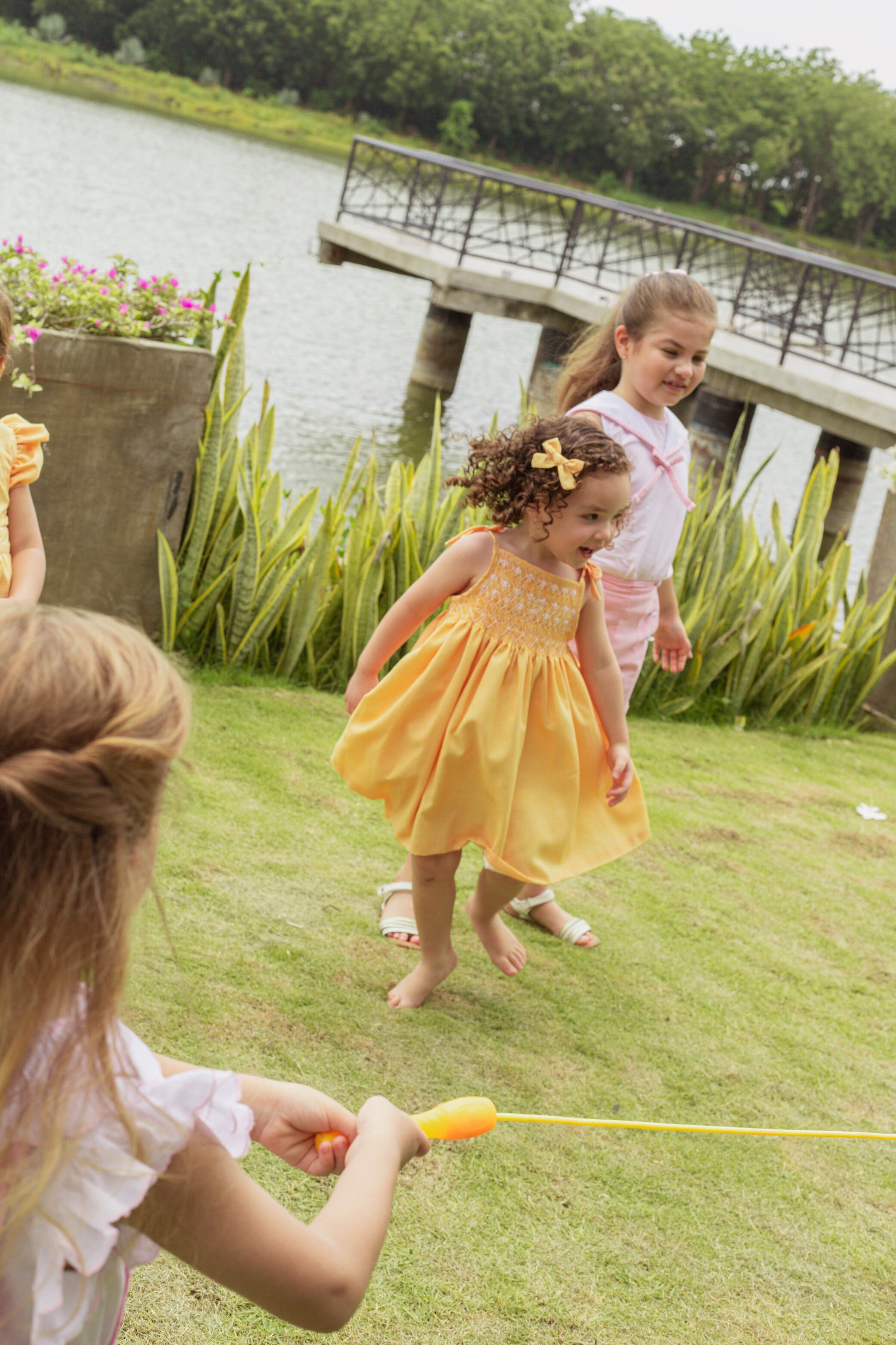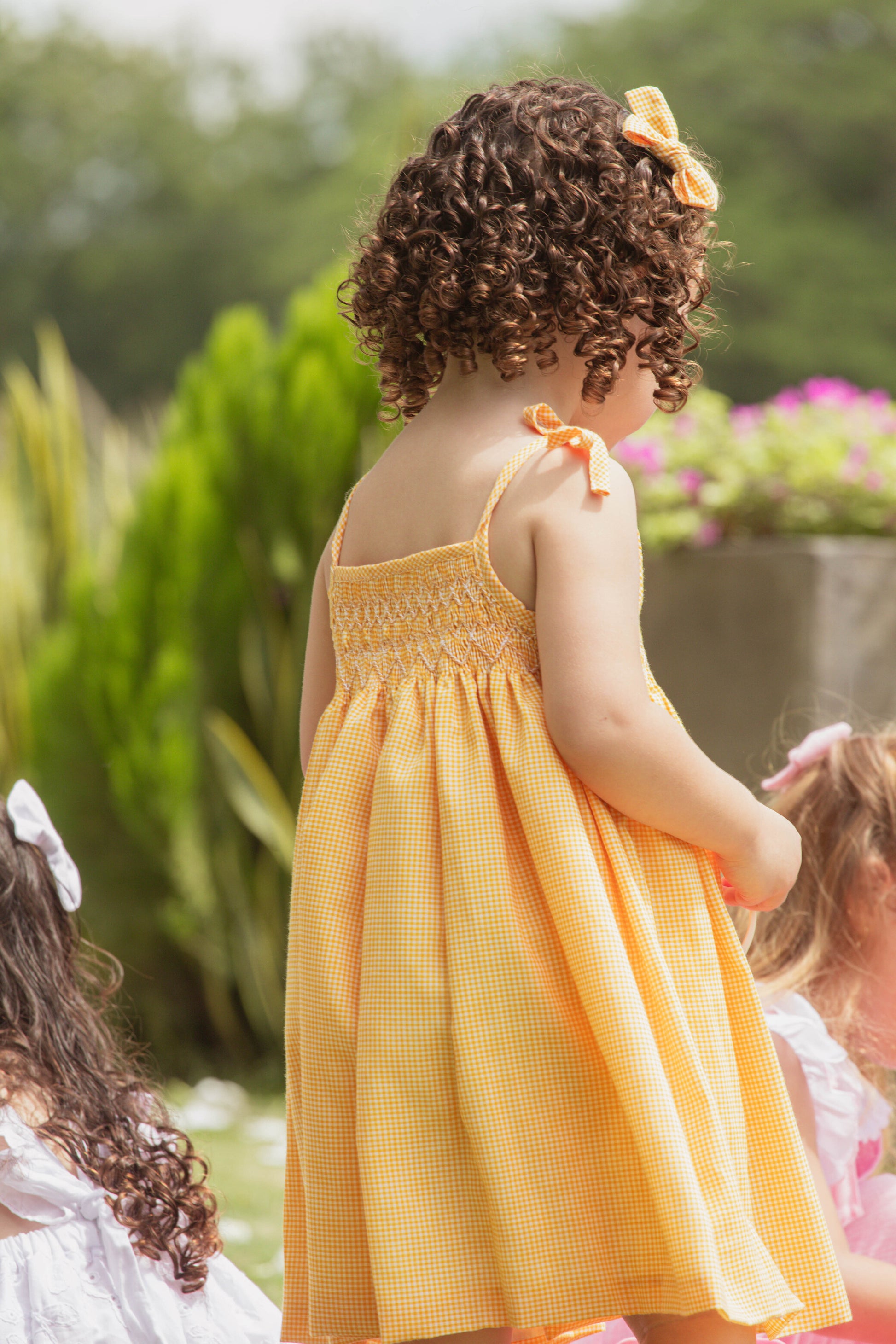 Este hermoso vestido ideal para los días calurosos se anuda en sus hombros y cuenta con un delicado bordado a mano en pecho y espalda en punto smock, forrado 100% algodón.