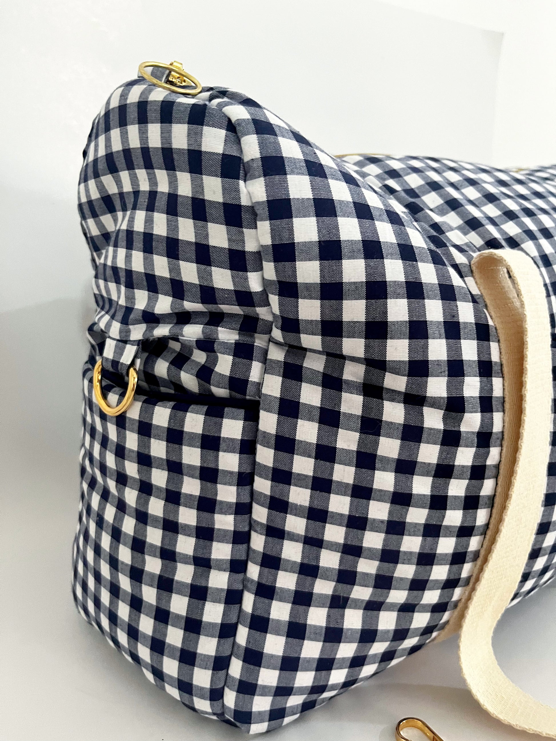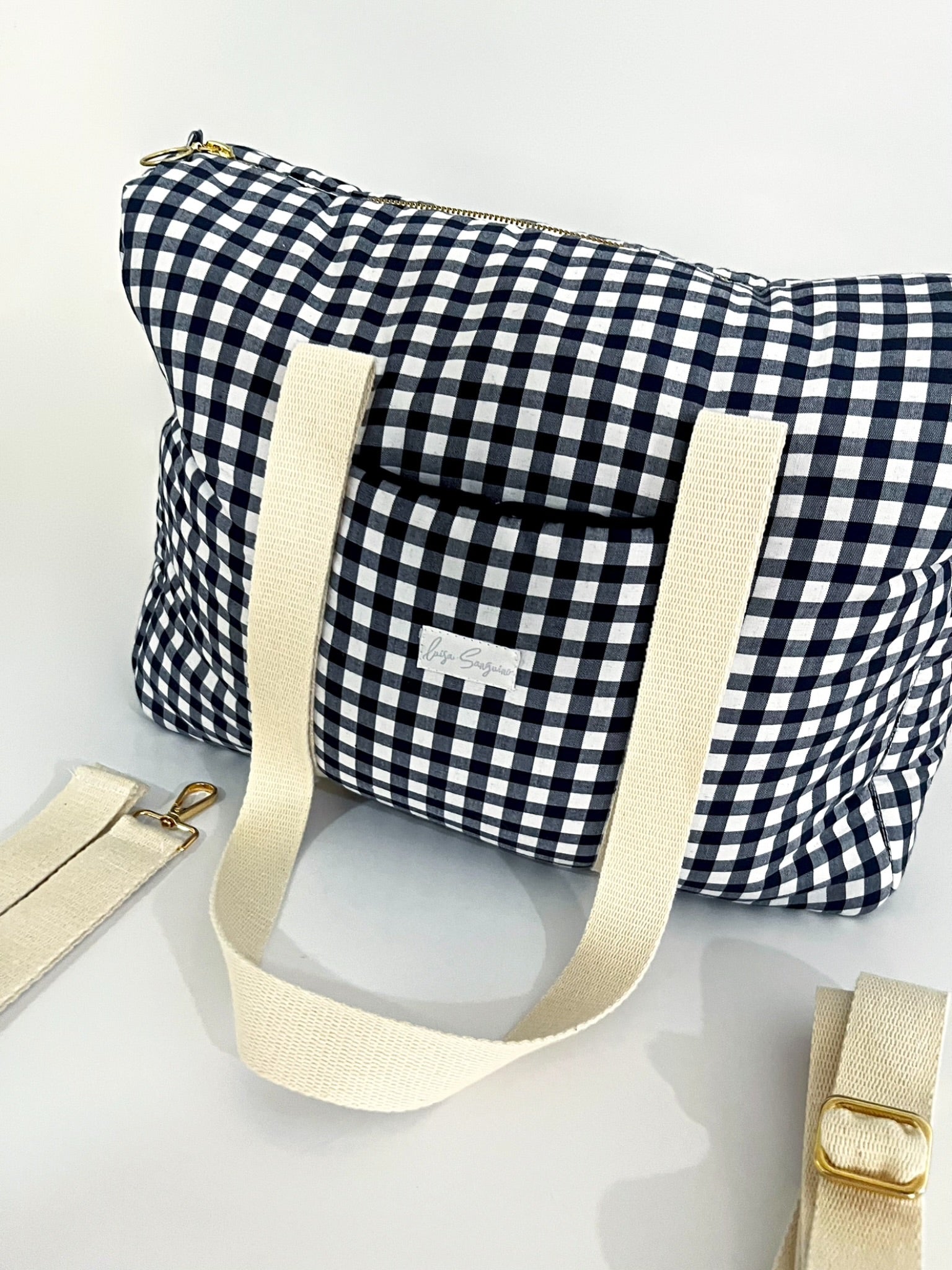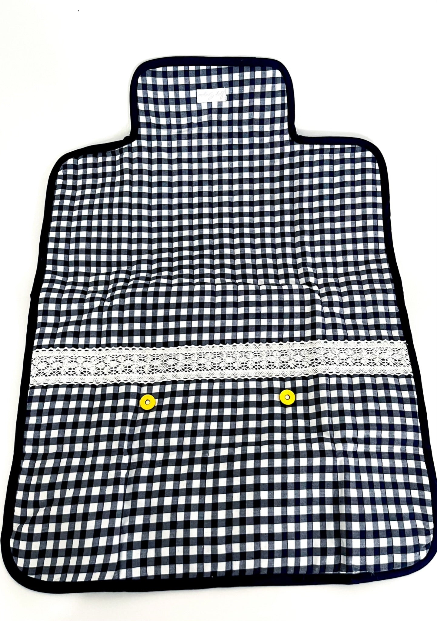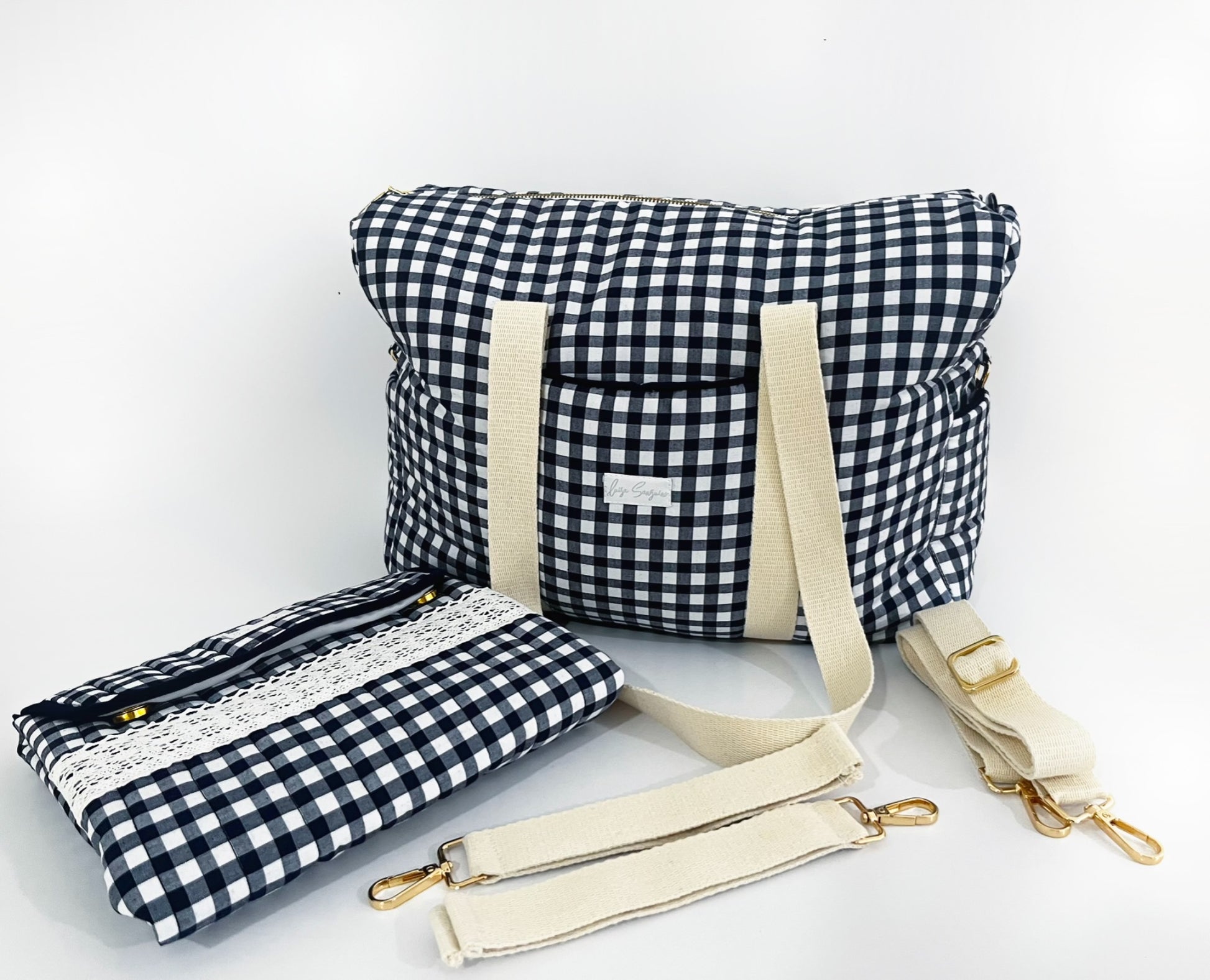 Esta hermosa Pañalera es hecha en algodón forrado en anti fluido. En su parte interna cuenta con 6 bolsillos y la parte externa con 4 bolsillos externos. Sujetador coche, sujetador bolso. Riata de algodón