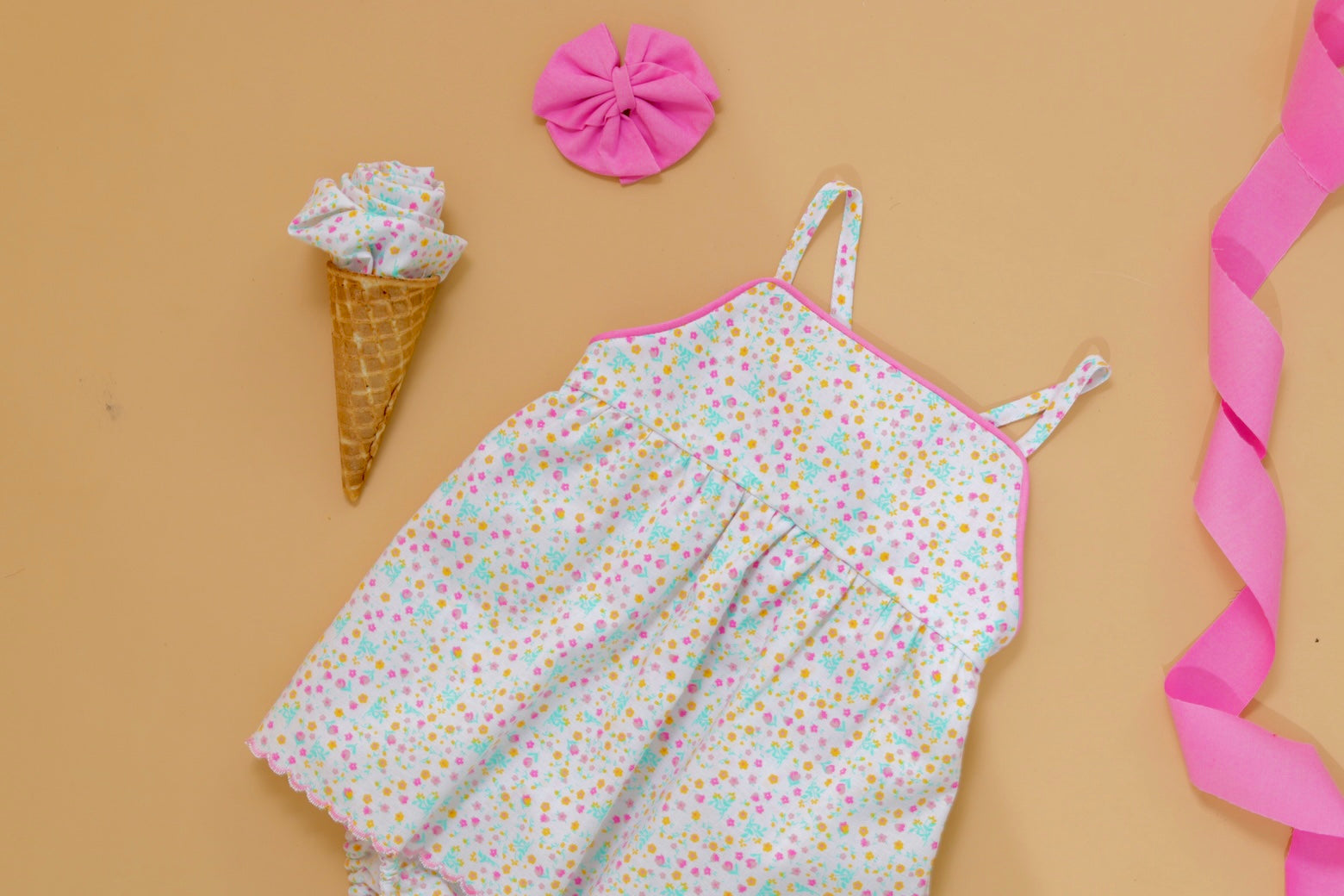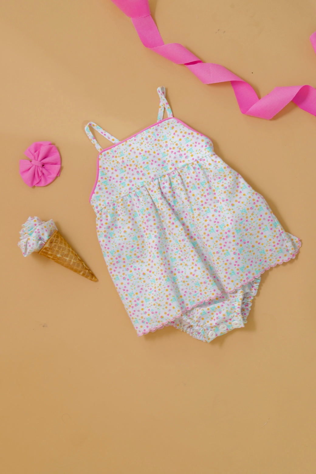 Hermoso pelele de tirantes y falda bailarina que cuenta con unas ondas en sus orillas. Los tirantes son ajustables con un lazo en espalda y lleva botones en entrepiernas para facilitar el cambio del pañal.