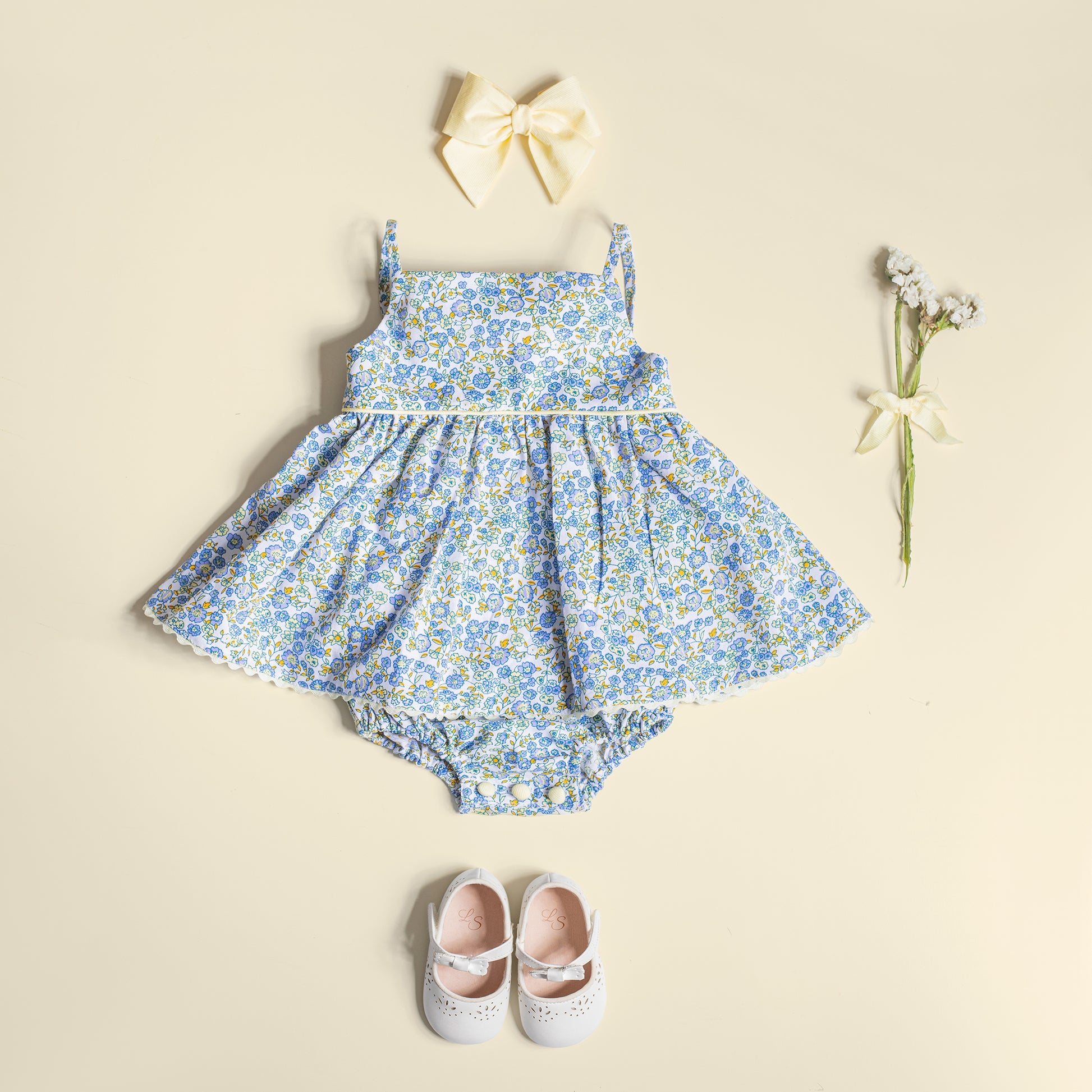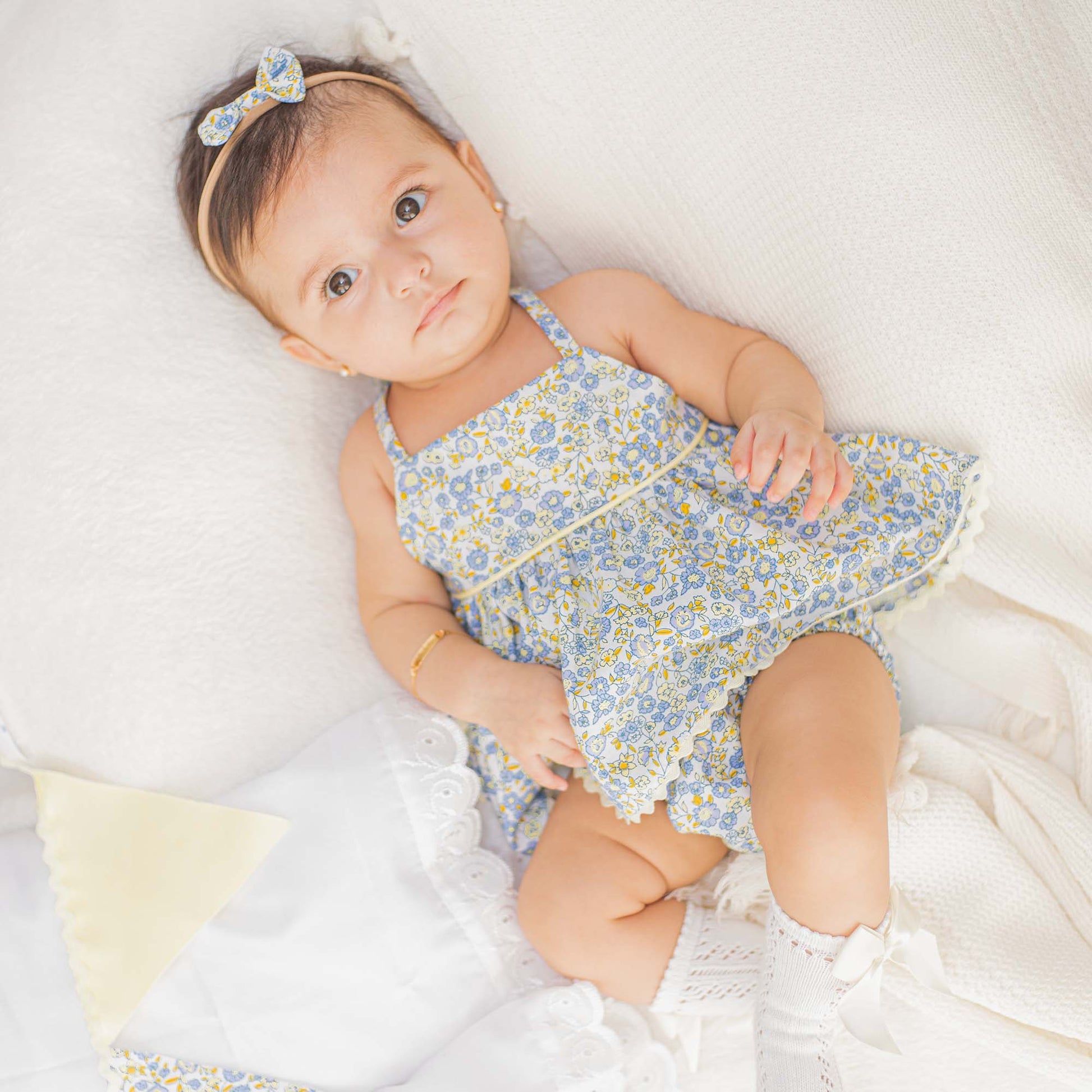 Ranita de niña en tejido estampado floral en tonos azules y amarillo, tiene una trencilla de color amarillo en el borde de la falda, un sutil cordón amarillo entre el canesú y la falda y cuenta con unos tirantes ajustables que se anudan en la parte de la espalda. Podrá usarla tanto sola como con otra prenda debajo. Lleva botonadura inferior forrada para facilitar el cambio del pañal.