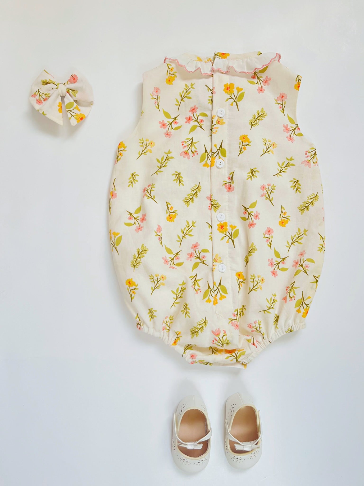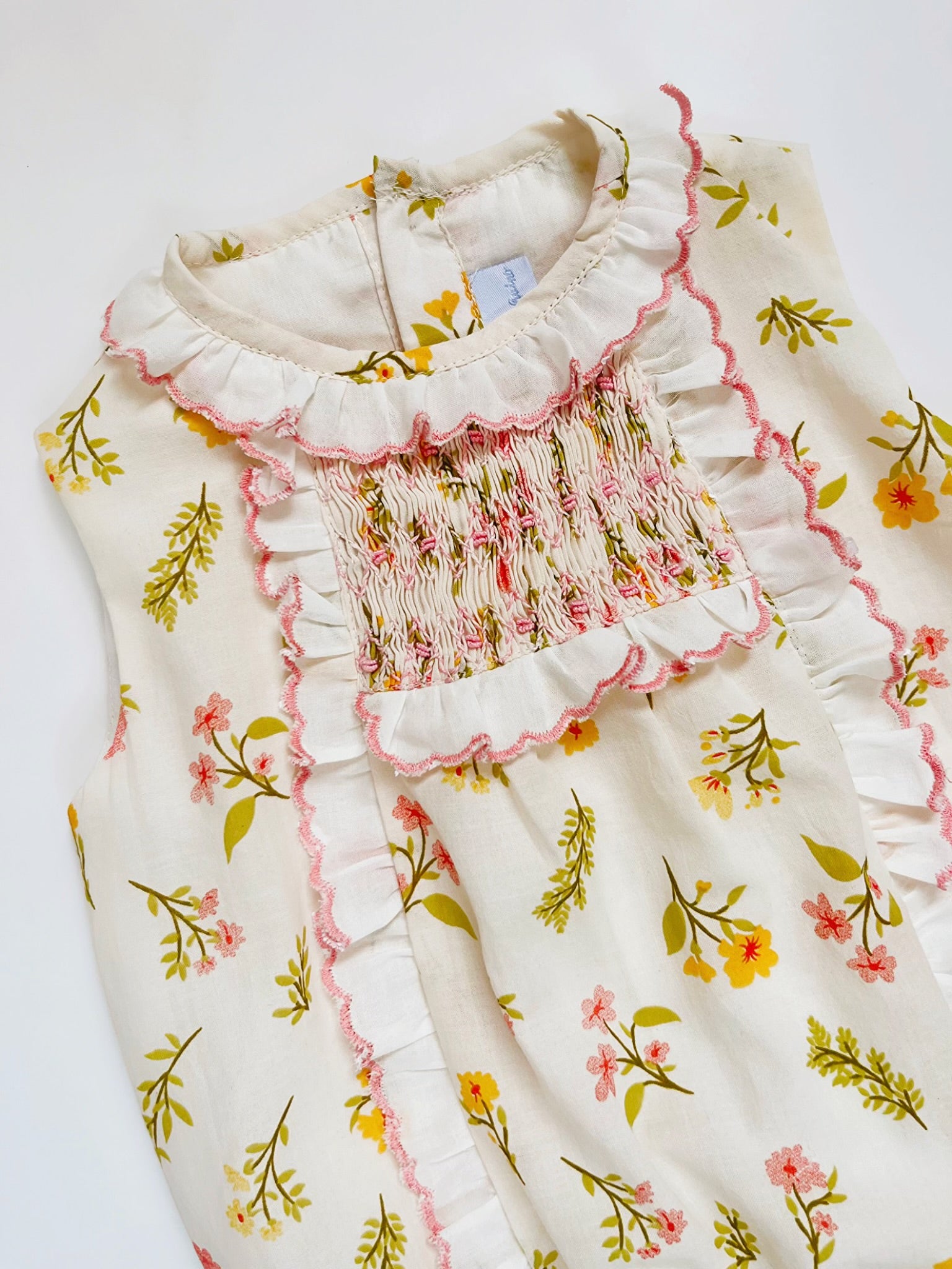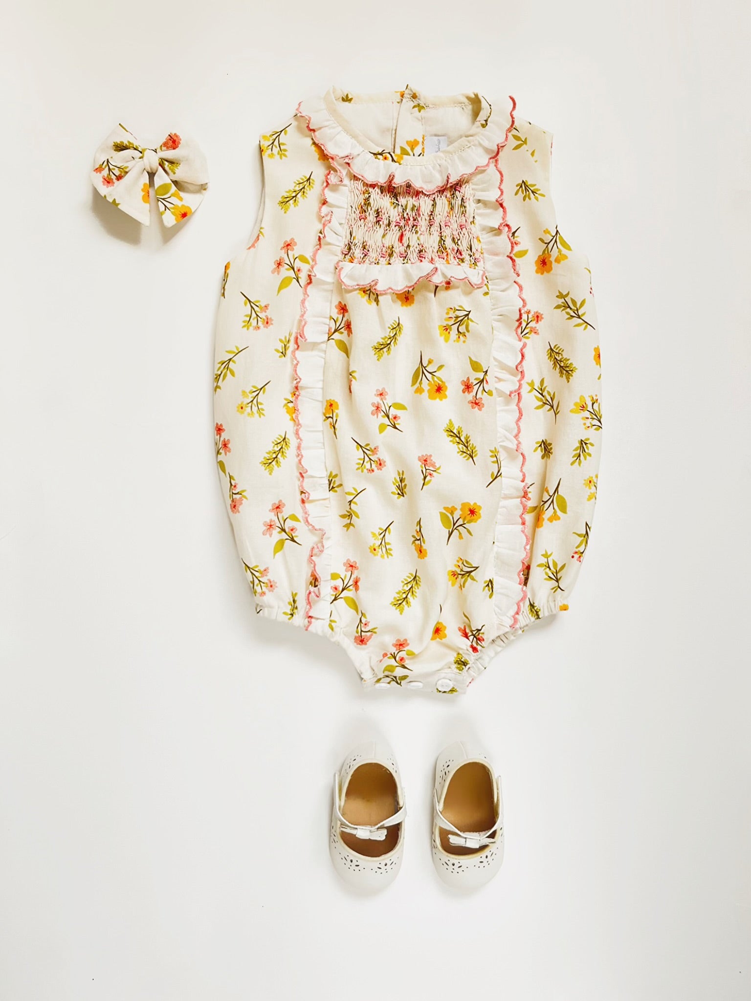 Este encantador pelele cuenta con pecho bordado a mano en nido de abeja, cuello volantes y dos arandelas frontales, es un pelele romántico, cómodo y fresco, confeccionado en algodón 100%