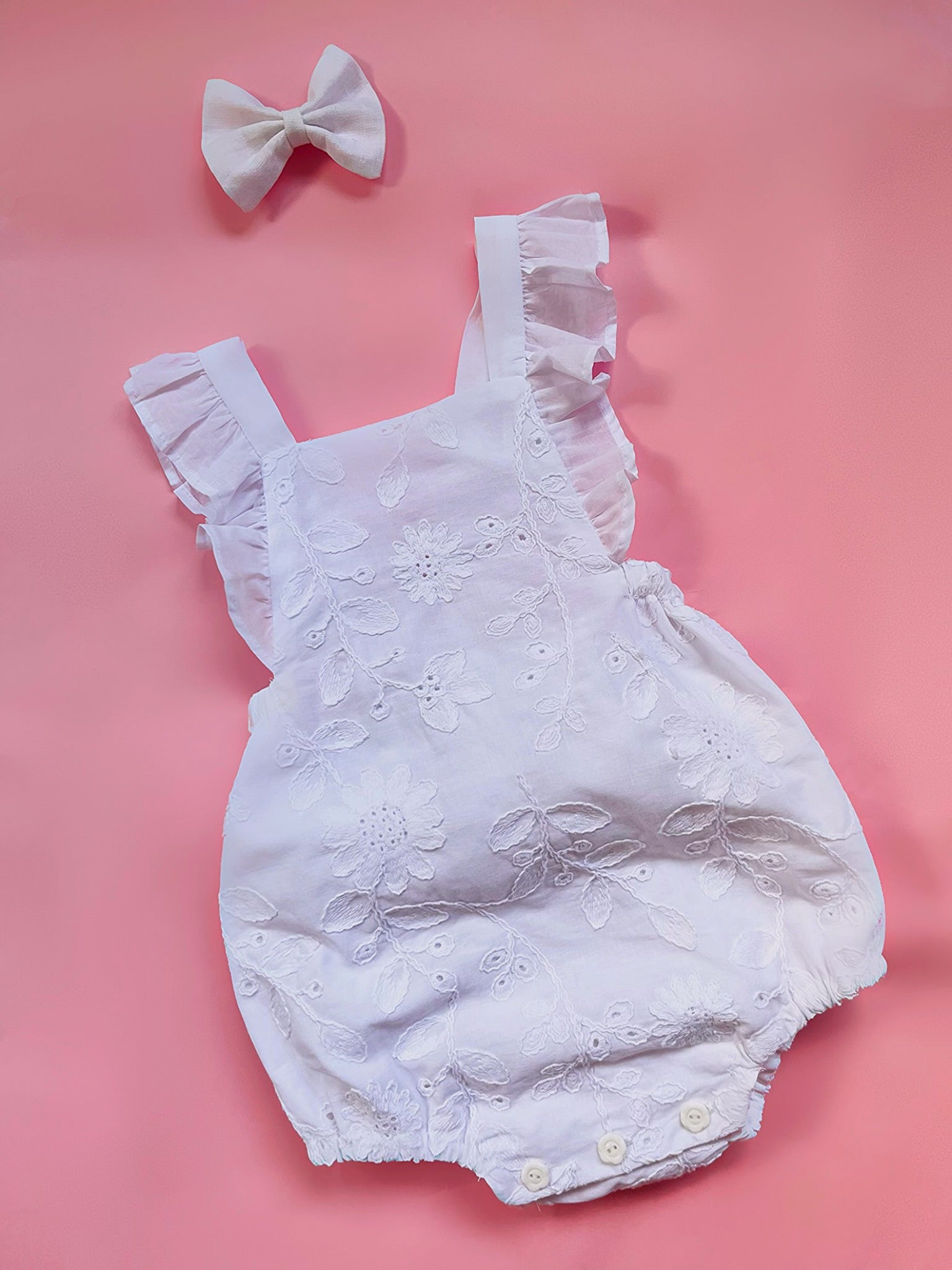 Este hermoso pelele de ojalillo con flores margarita es forrado en algodón 100% y cuenta con volantes en sus tirantes que se anudan en su espaldas el cual se ajusta como mas lo desees.