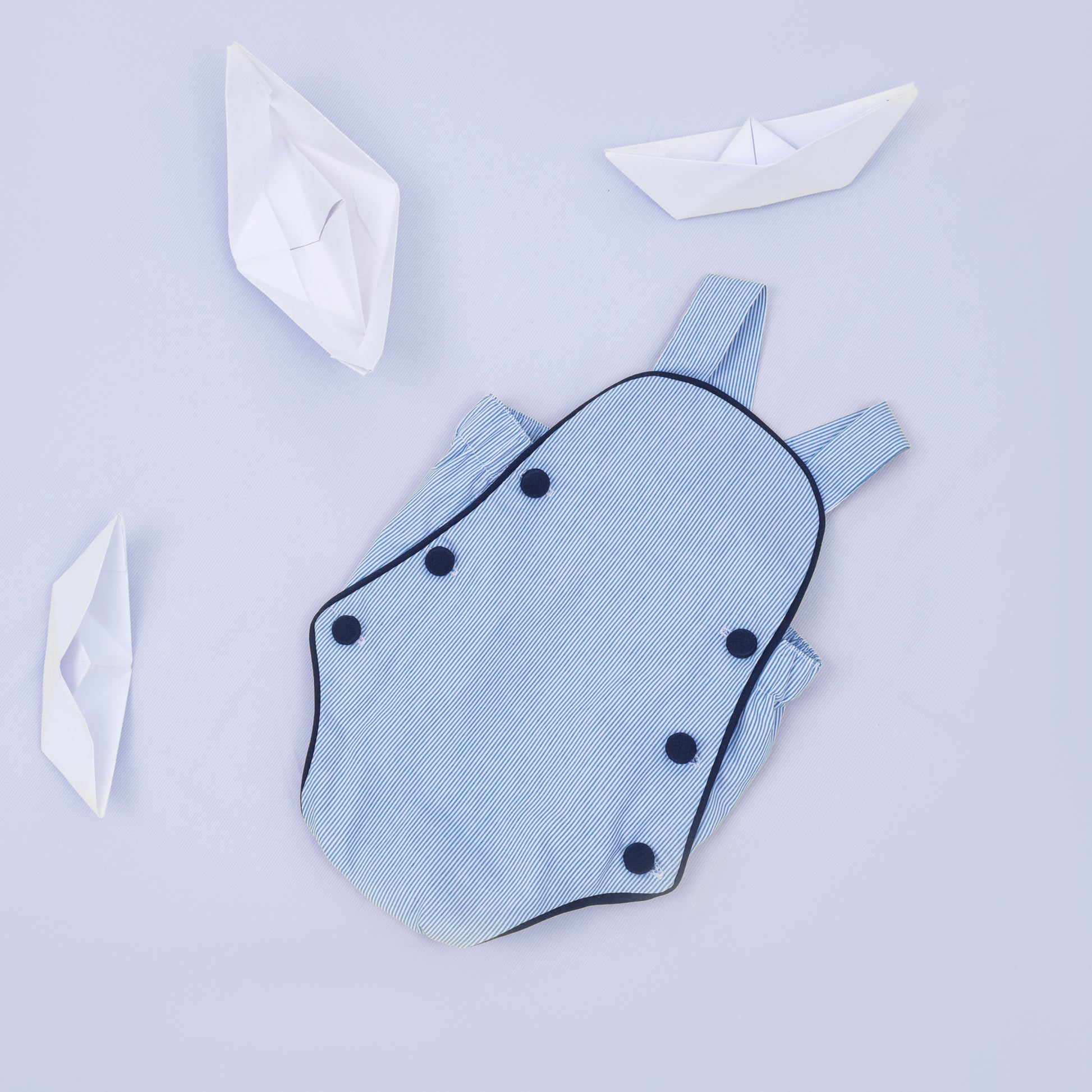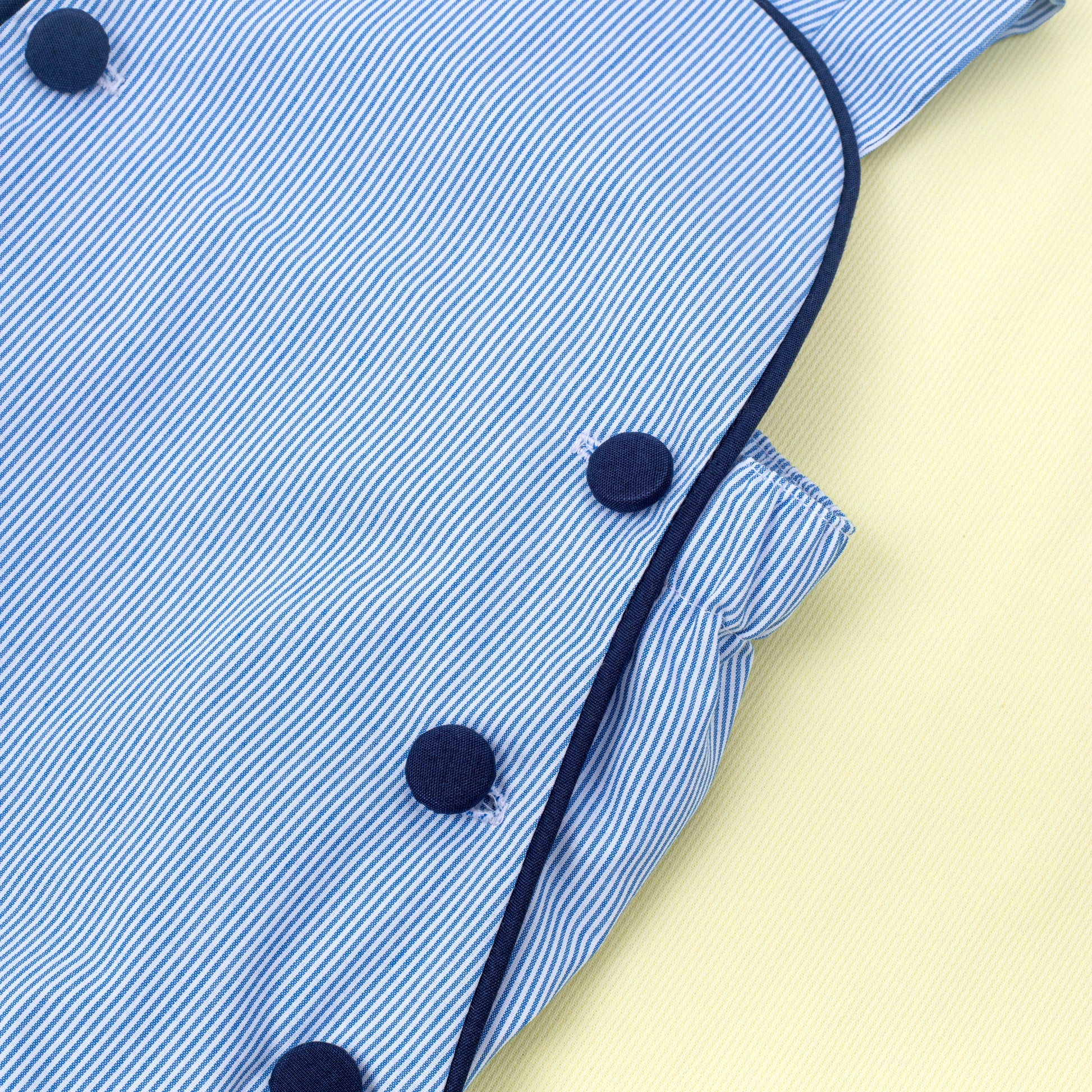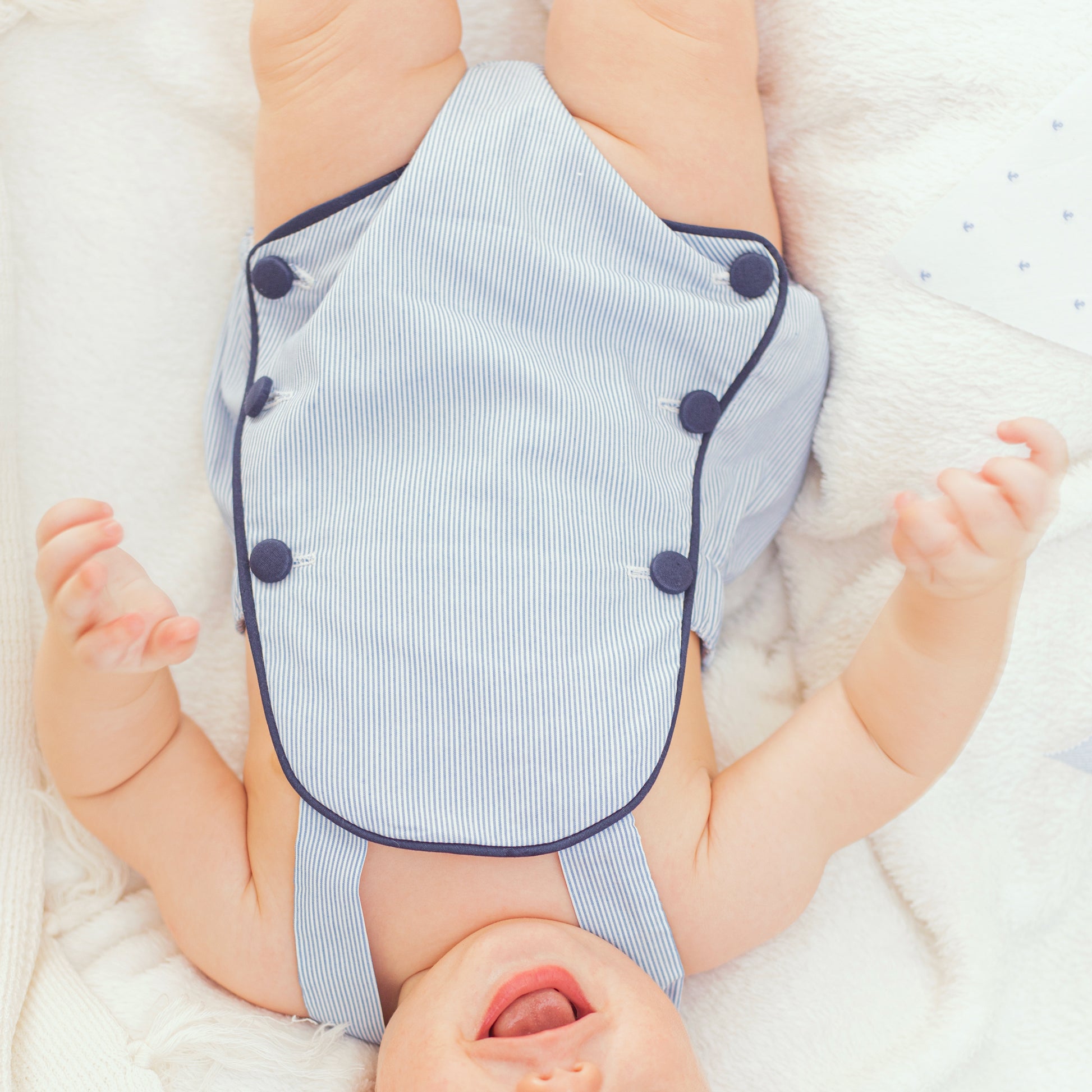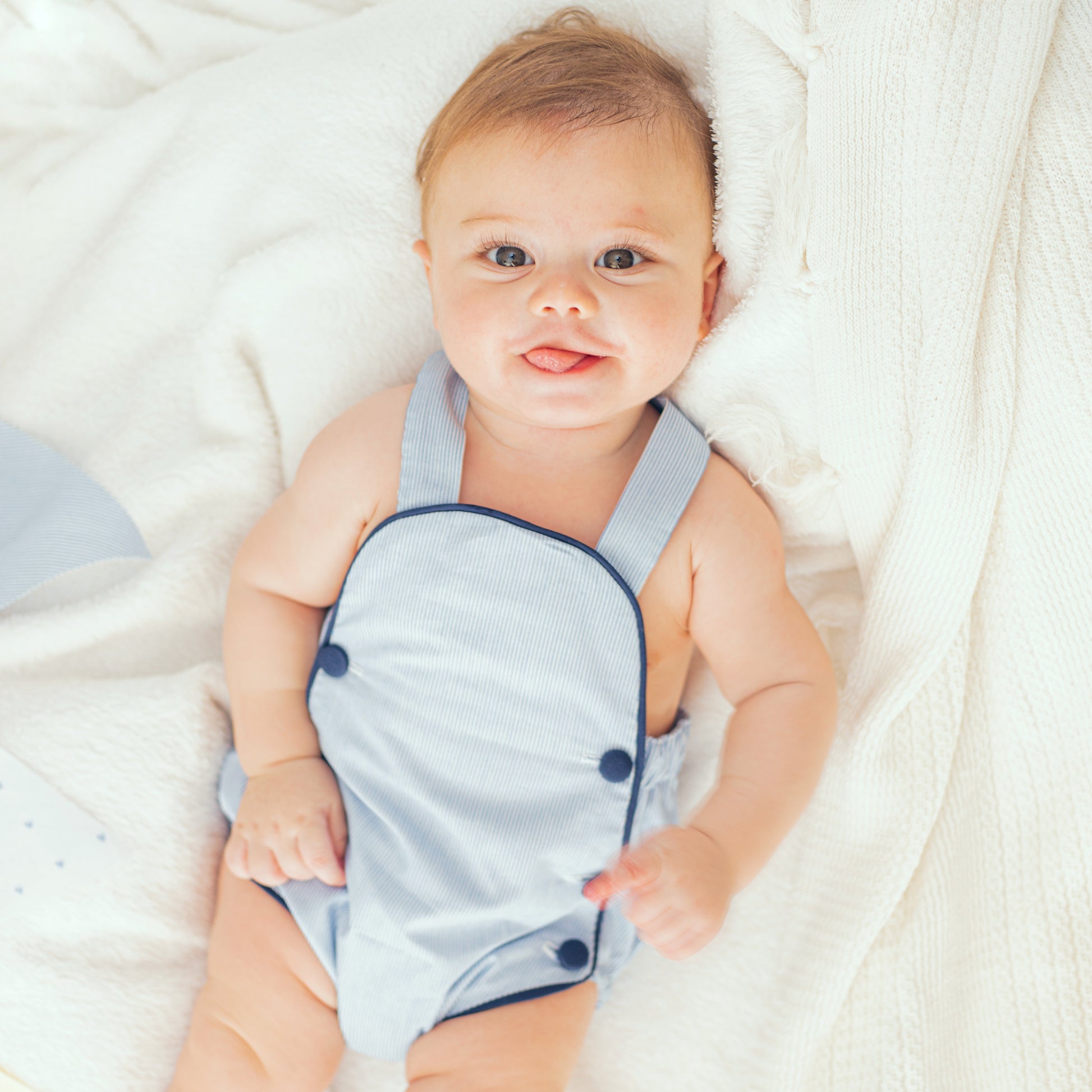 Este peto a rayas es un estilo perfecto para que tu bebé se siente y disfrute del verano. Presenta un patrón de rayas en azul y blanco. Tiene un cordón azul turquí llamativo en el borde y seis botones forrados que se abren para cambiarse fácilmente. Cuenta con una pretina elástica de tiro bajo para facilitar el movimiento. Los tirantes son ajustables con botón de nácar en la parte posterior. Puedes combinarlo con una camisa debajo para completar el look.