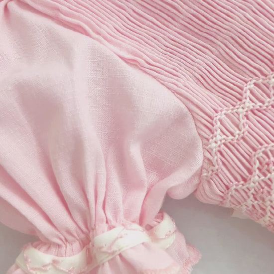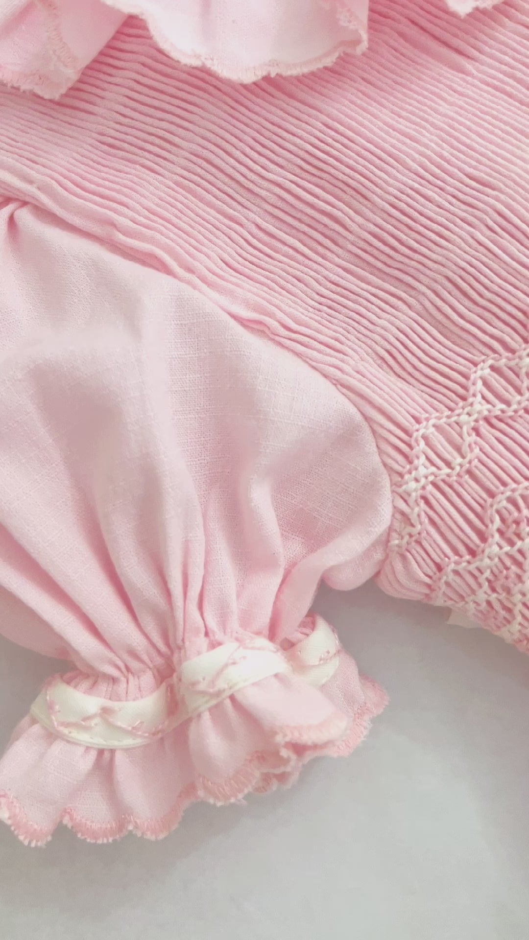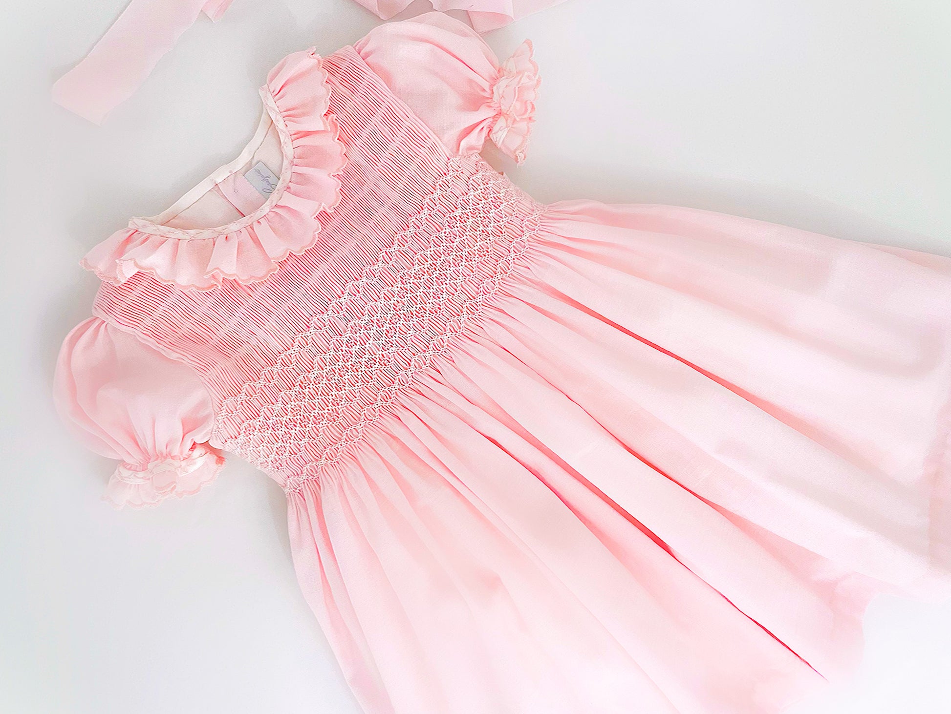 Un vestido en punto smock en tono rosa con detalles en blanco.