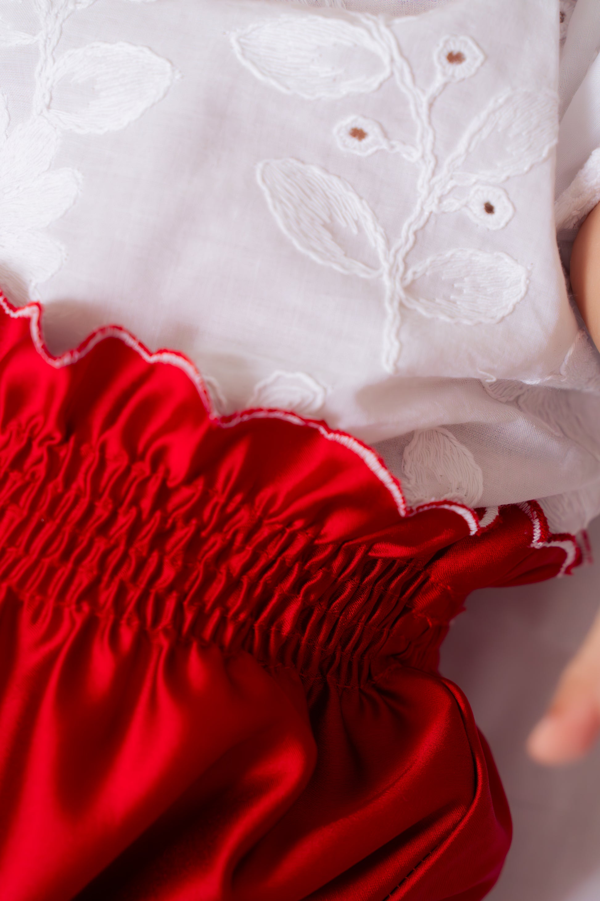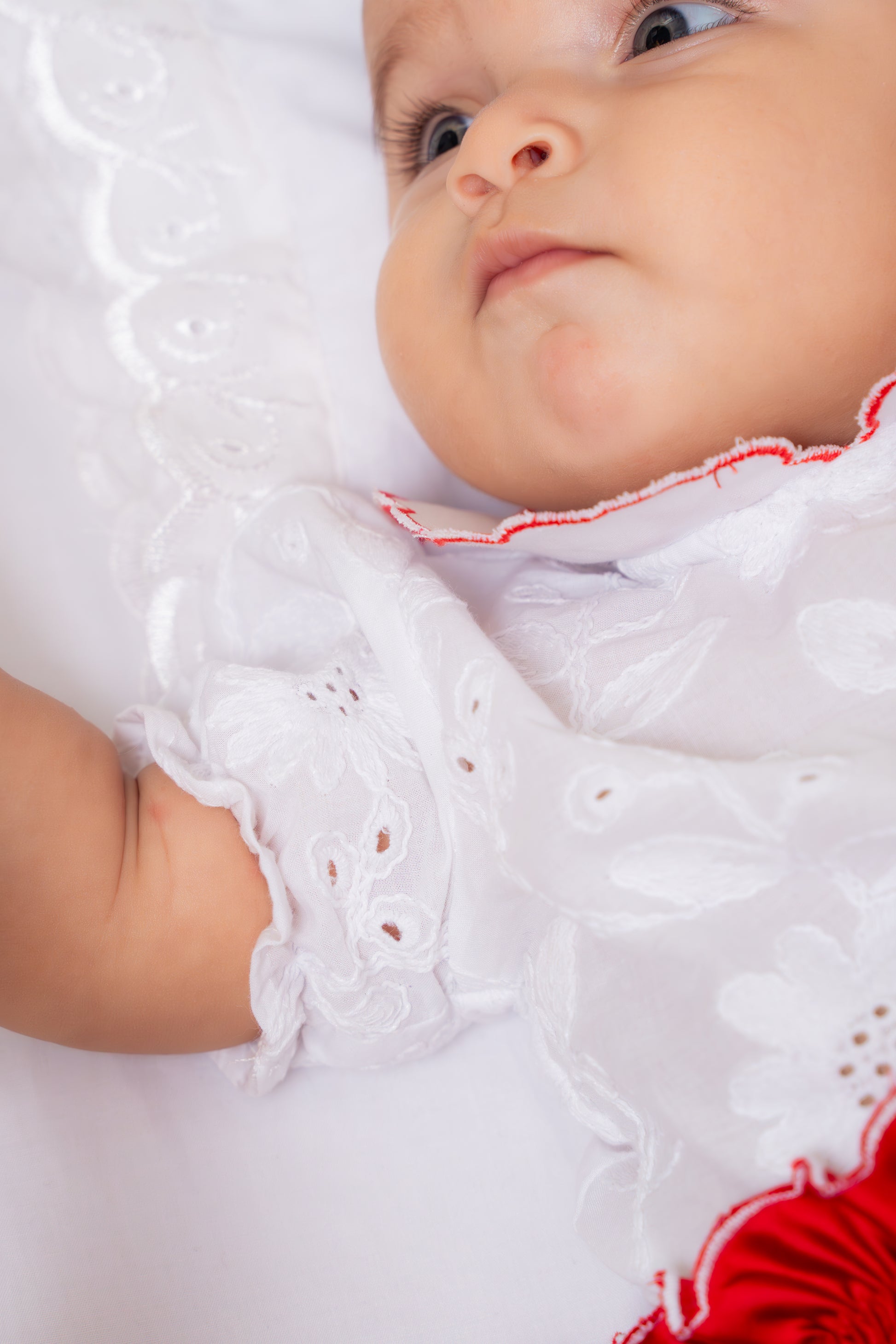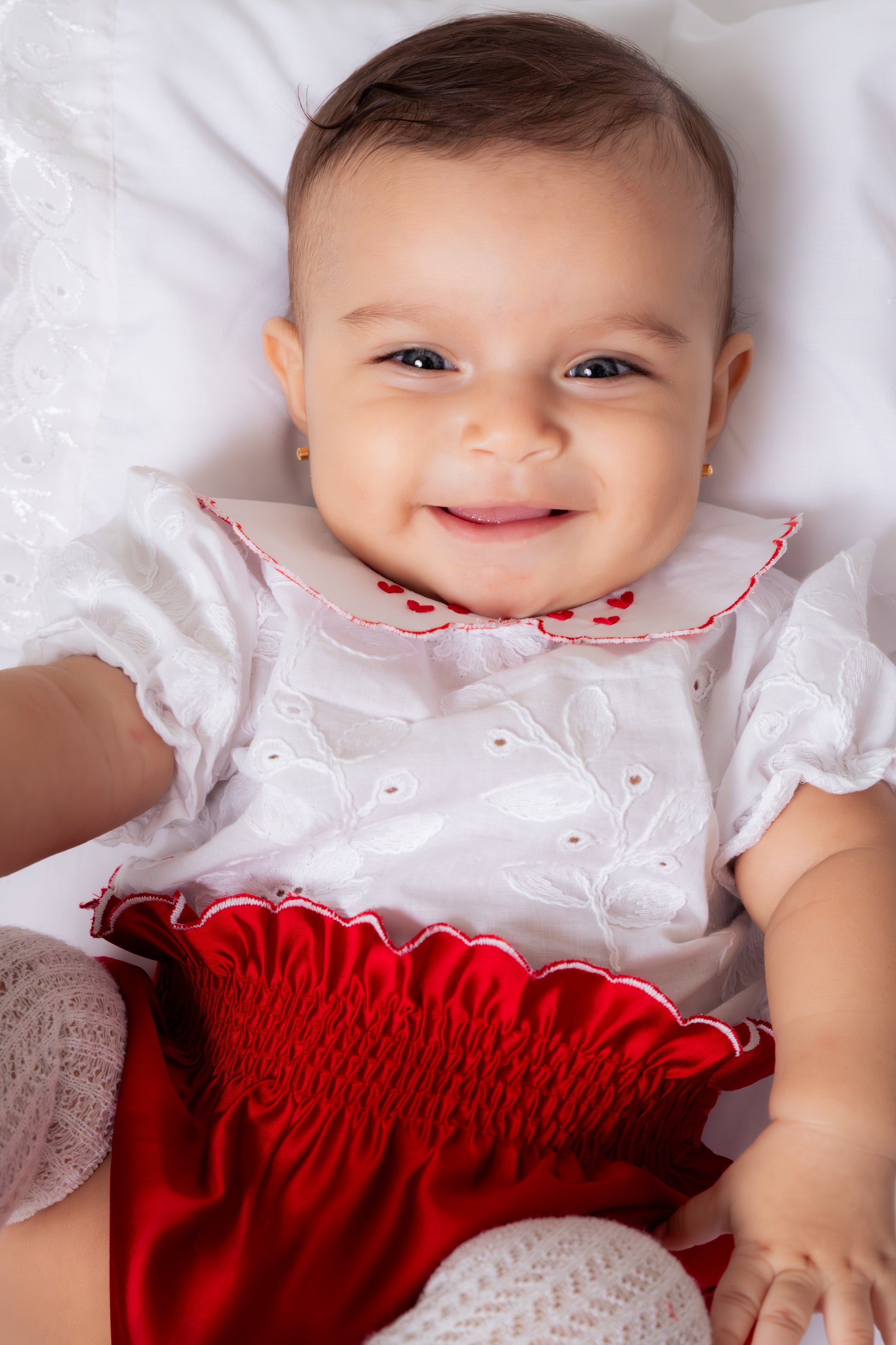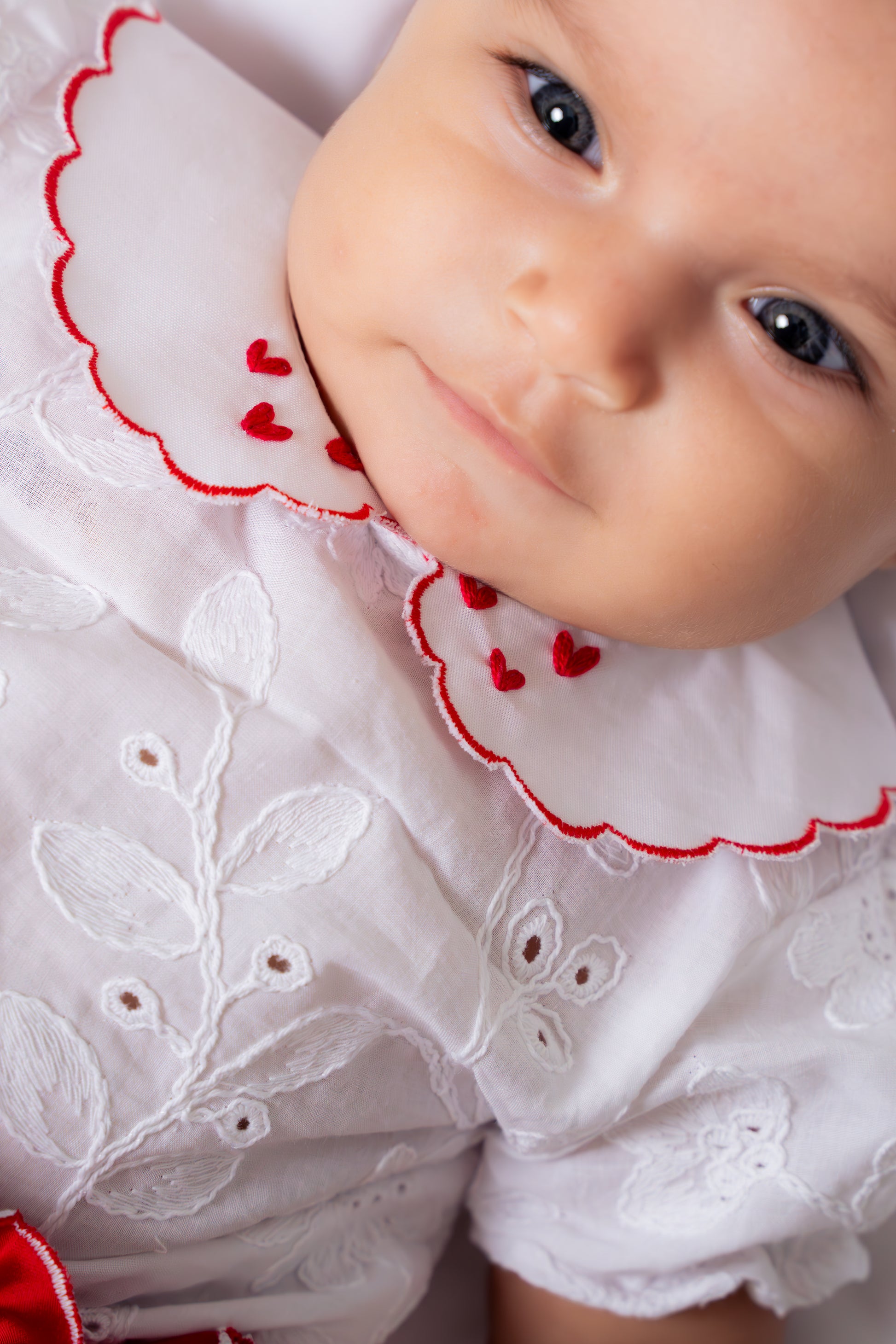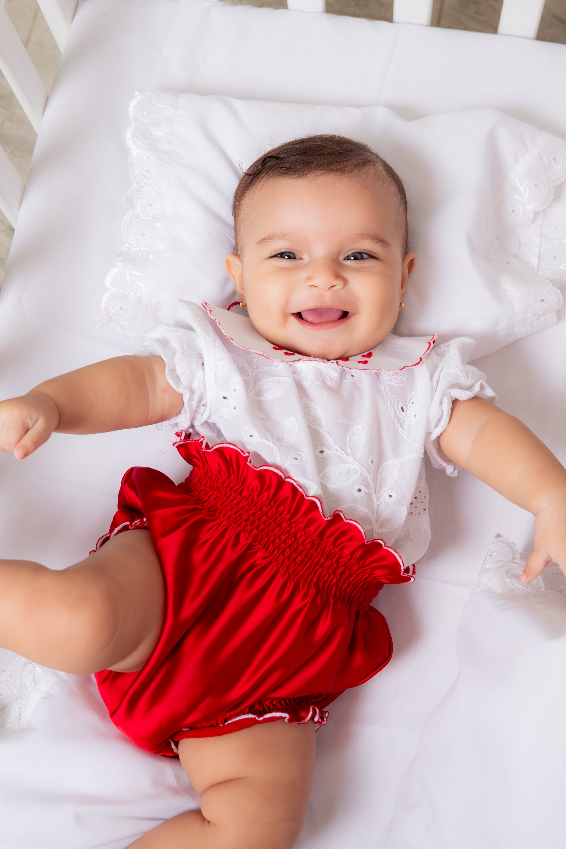 Este encantador conjunto cuenta con un cubre pañal en seda roja que lleva detalles de ondas blancas en entrepiernas y cintura. Cuenta con una blusa en ojalillo con cuello bebé en ondas rojas y 3 mini corazones en cada cuello, botones rojos en forma de flor.