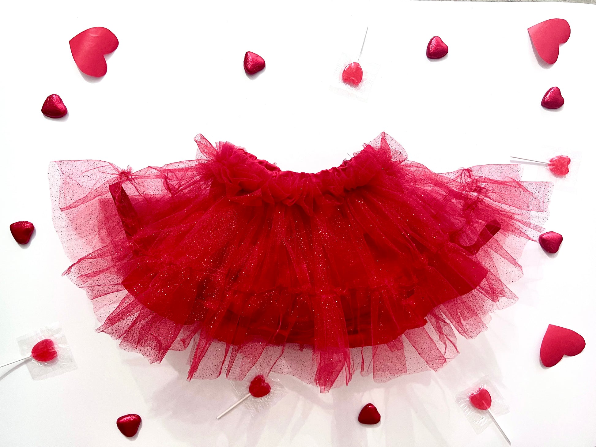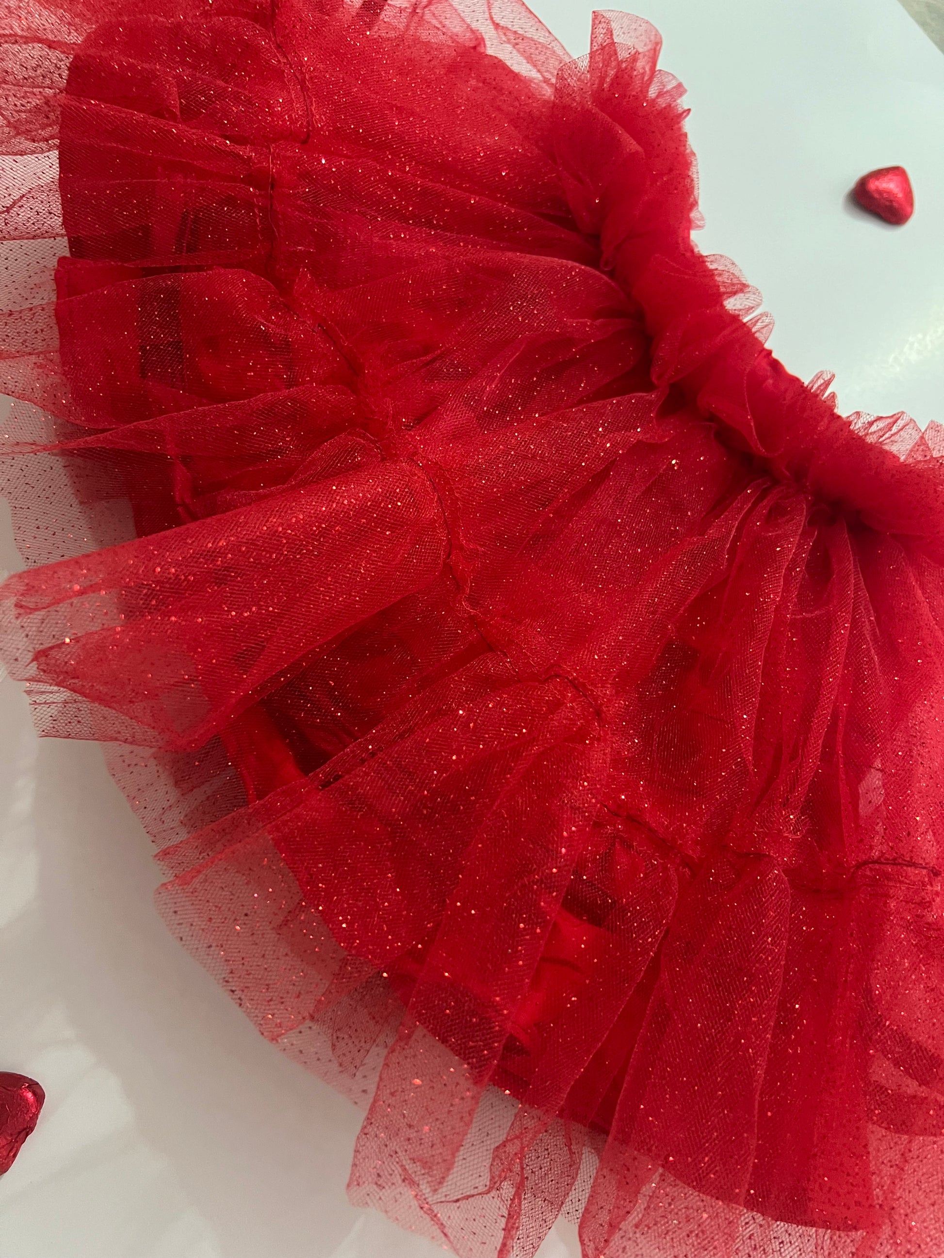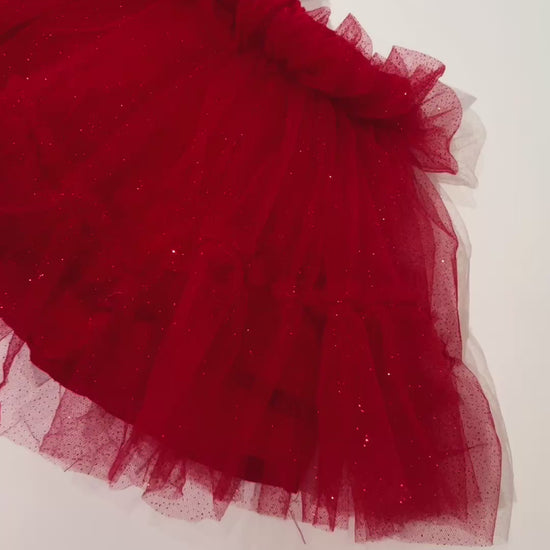 Este encantador tutú rojo escarchado es forrado en algodón 100% y cuenta varias capas de tul, volante en su orillas. Cintura elástica e incluye bombacho.