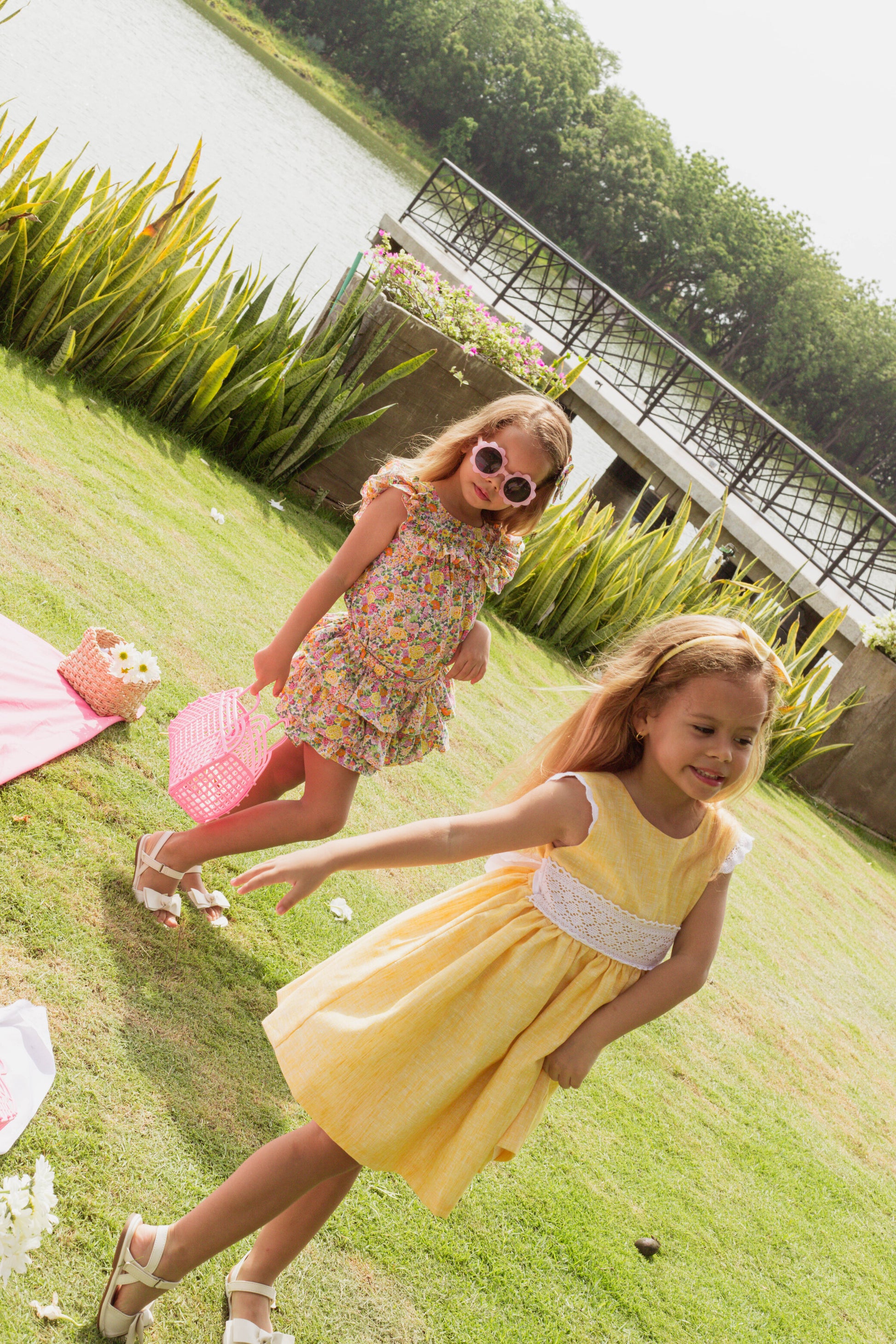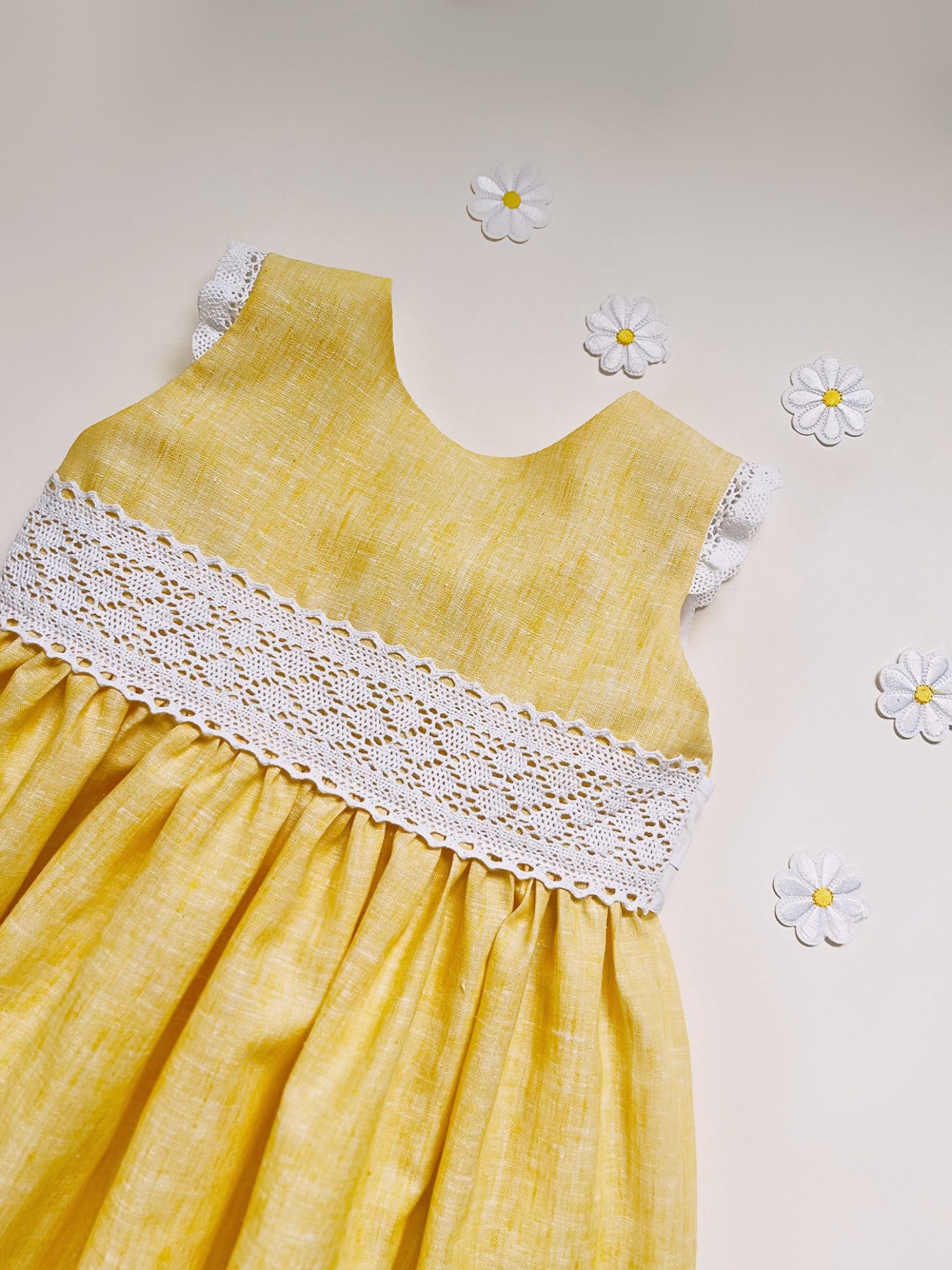 Este hermoso vestido confeccionado en lino amarillo pixel se encuentra forrado en algodón 100% y lleva unas delicadas puntillas que hacen pequeñas mangas volantes, en su cintura alta delantera lleva una hermosa puntilla gruesa y en su espalda se anuda con lazada blanca. cuenta con botones forrados e incluye bombacho.