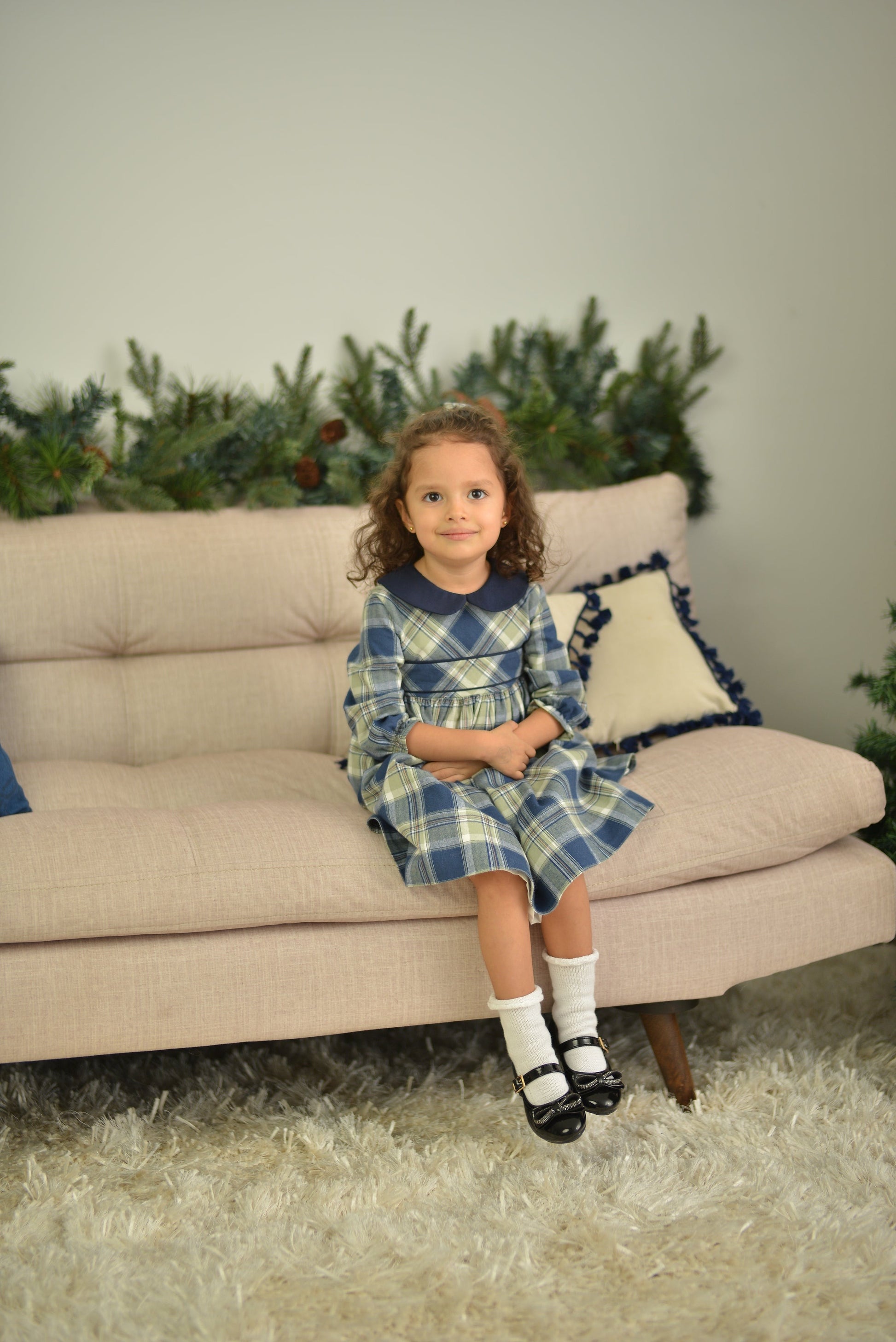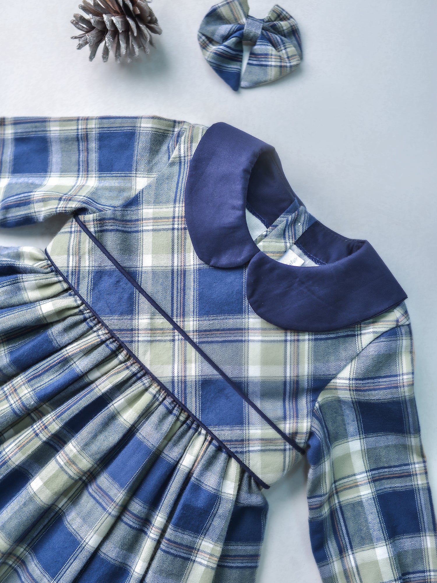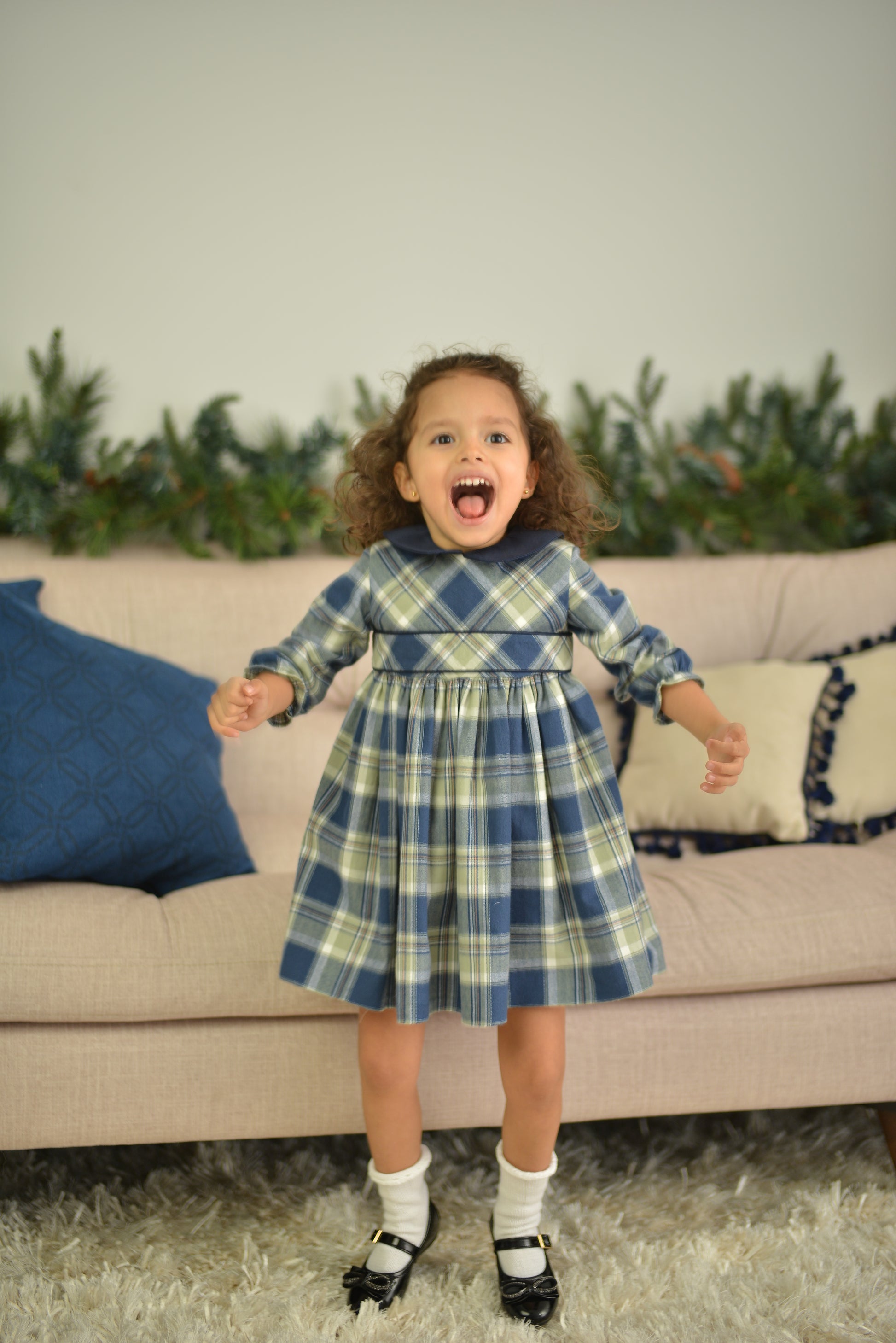 Un estilo clásico británico tradicional de manga larga está confeccionado con algodón 100 % es un suave tejido a cuadros escoceses en azul y verde pino. Presenta un llamativo cuello en azul marino y un cinturón alrededor de la cintura que se abrocha en la parte posterior con botones forrado en azul marino. Tiene puños elásticos con dulce volante. Este clásico vestido es perfecto para la temporada navideña y también perfecto para usar en cualquier otra ocasión formal. incluye cubre pañal hasta talla 3 años