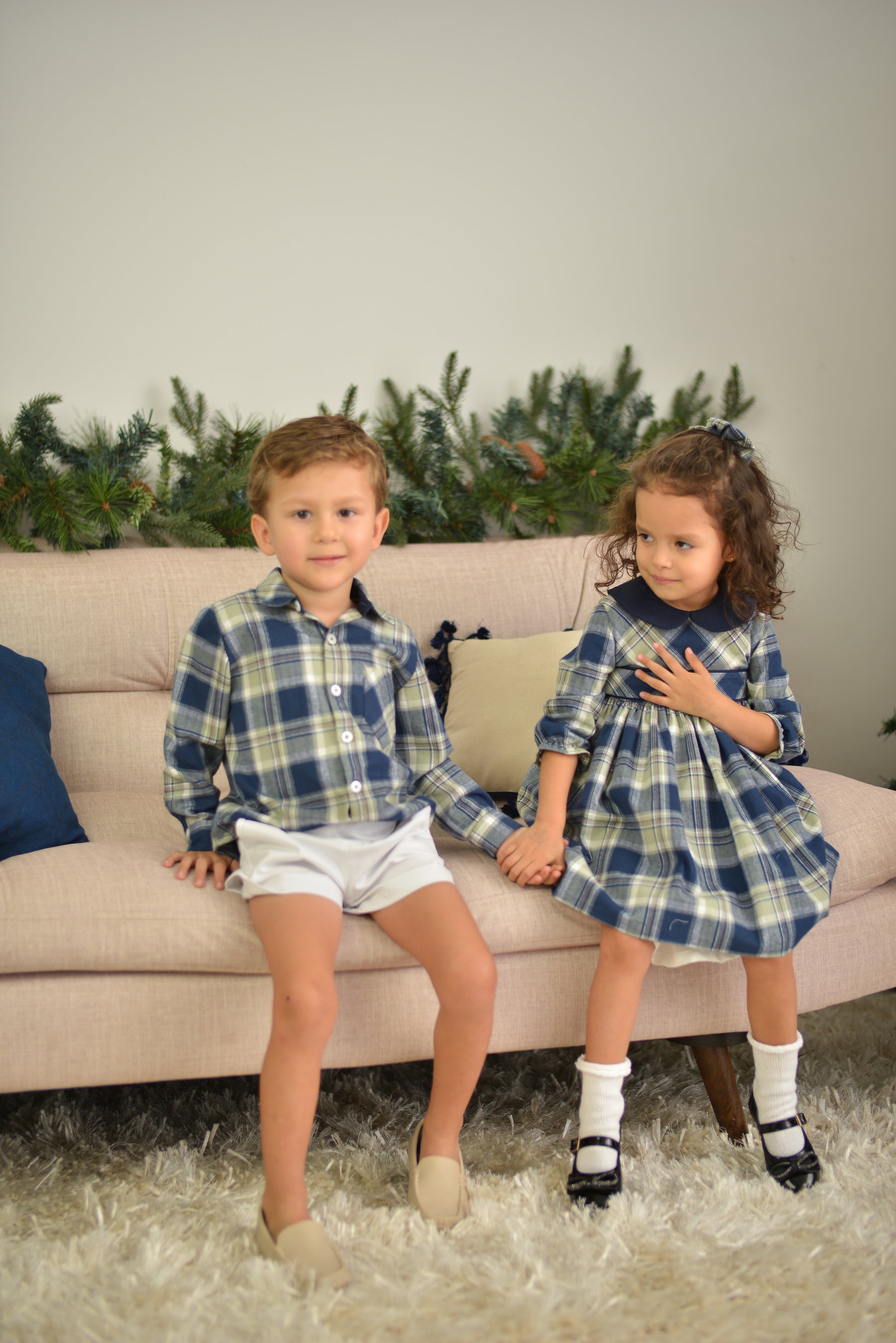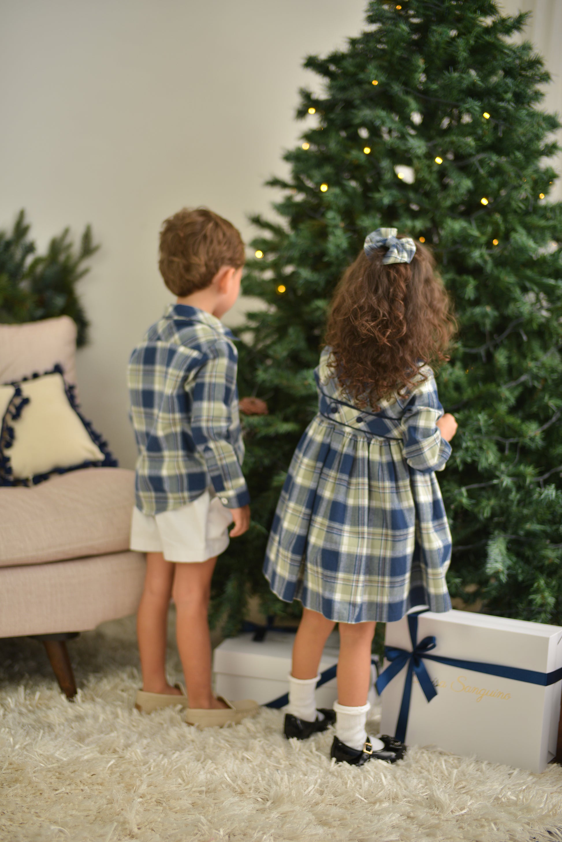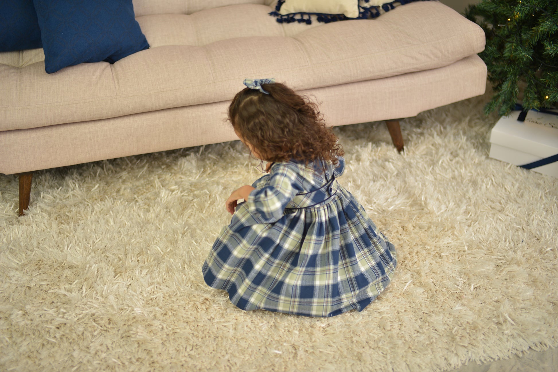Un estilo clásico británico tradicional de manga larga está confeccionado con algodón 100 % es un suave tejido a cuadros escoceses en azul y verde pino. Presenta un llamativo cuello en azul marino y un cinturón alrededor de la cintura que se abrocha en la parte posterior con botones forrado en azul marino. Tiene puños elásticos con dulce volante. Este clásico vestido es perfecto para la temporada navideña y también perfecto para usar en cualquier otra ocasión formal. incluye cubre pañal hasta talla 3 años