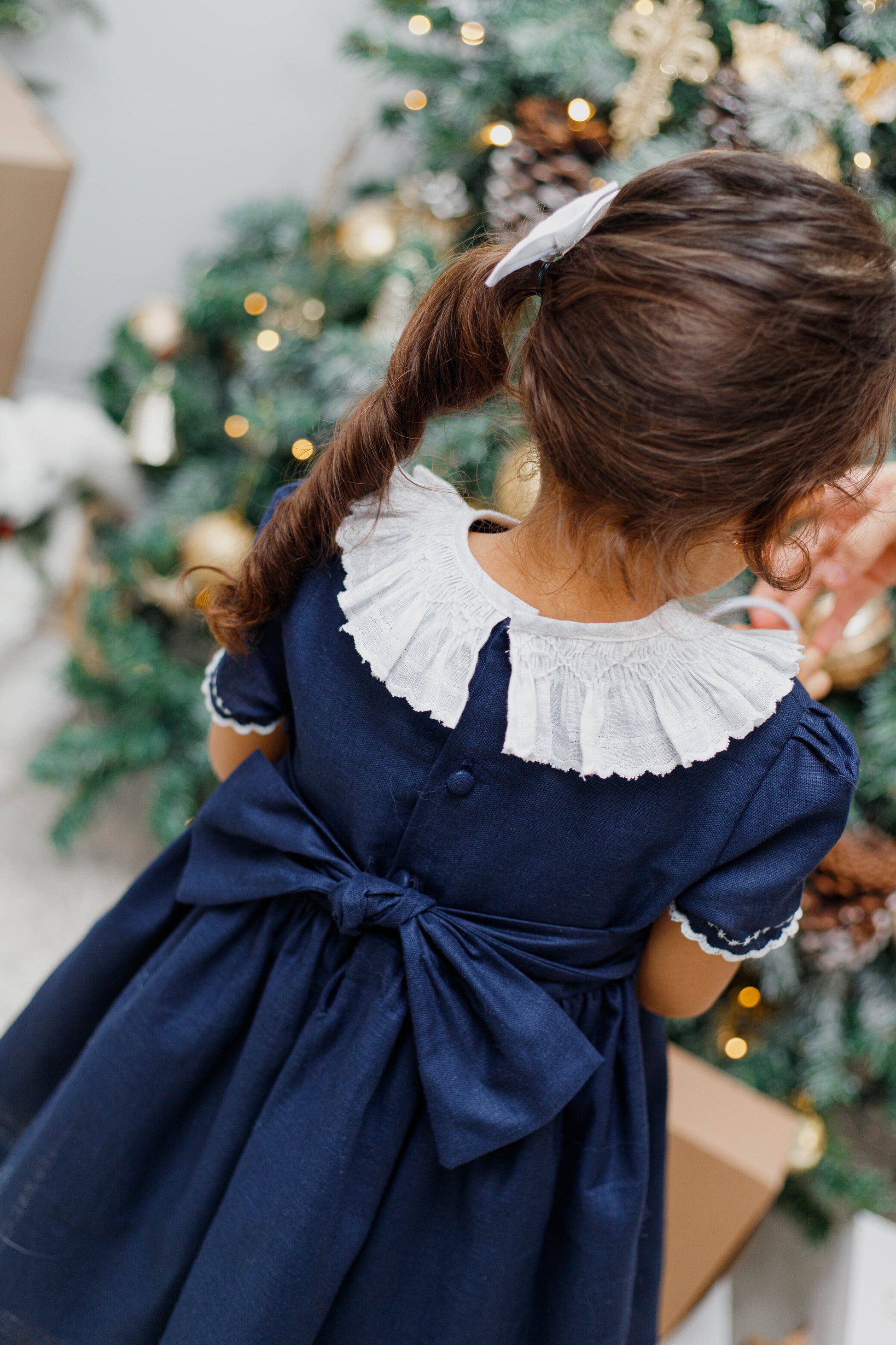 Este hermoso vestido esta diseñado en lino algodón azul turquí, cuenta con unas mangas cortas que llevan detallado en sus orillas unas ondas y estrellas en bordado blanco.