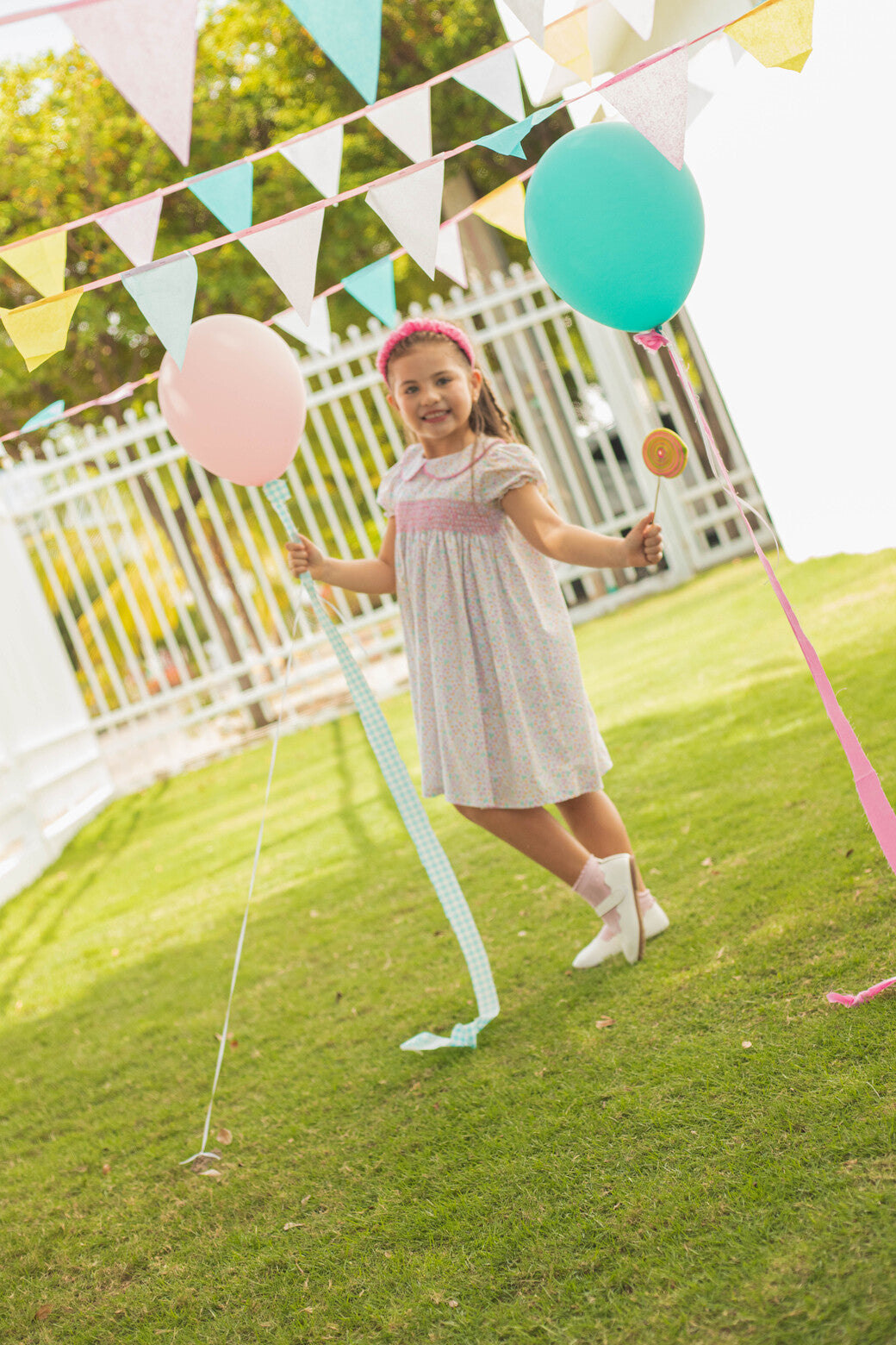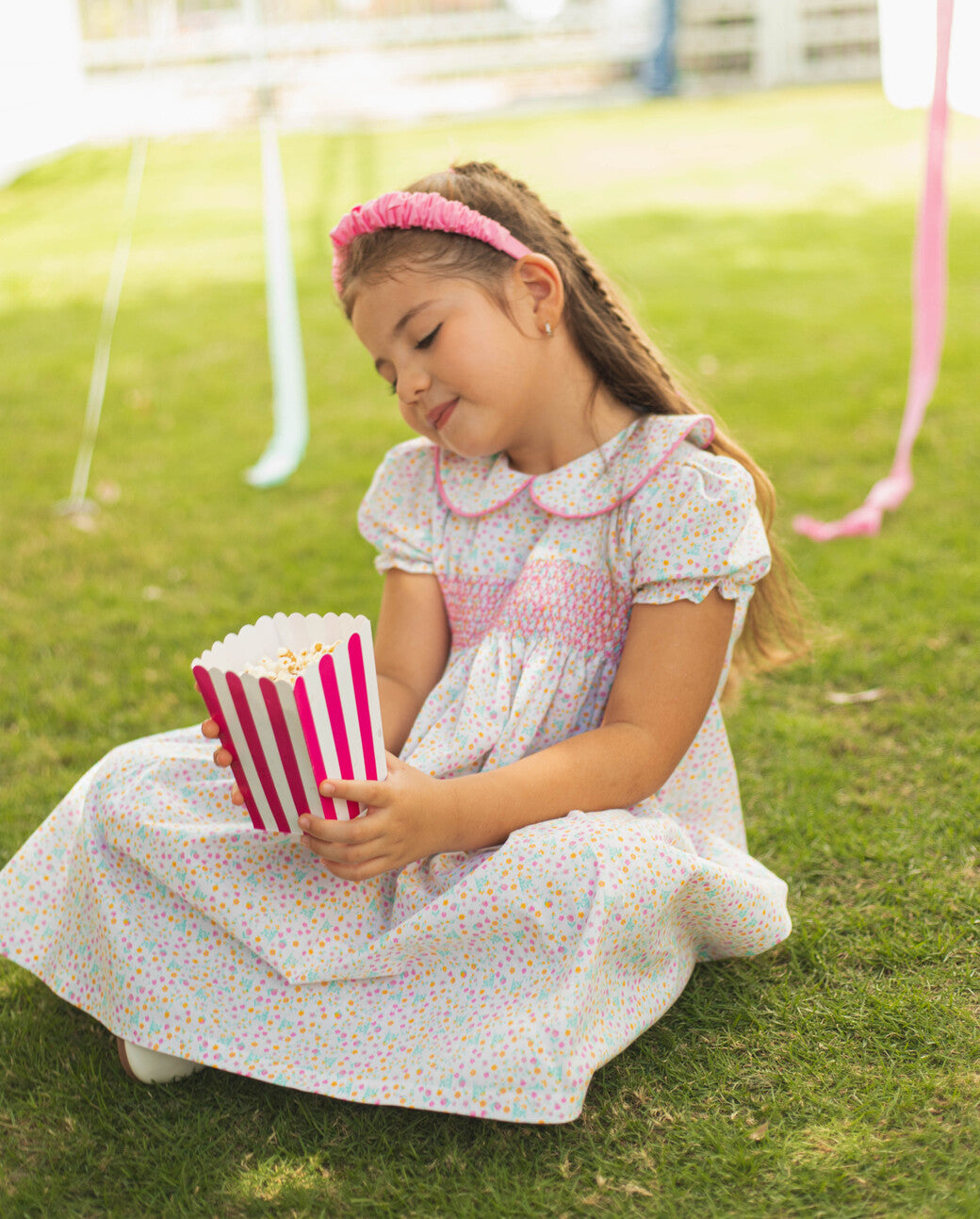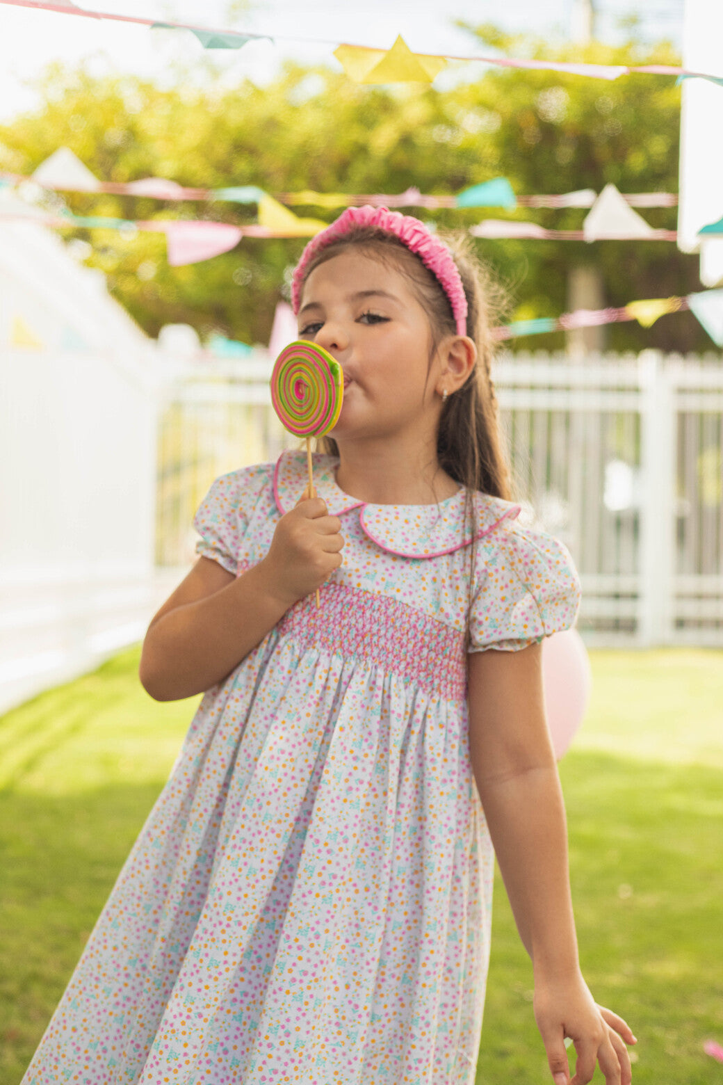 Vestido tipo bata con bordado nido de abeja en el pecho y mangas abullonadas, tiene un cuello bebe detallado con bies rosa.